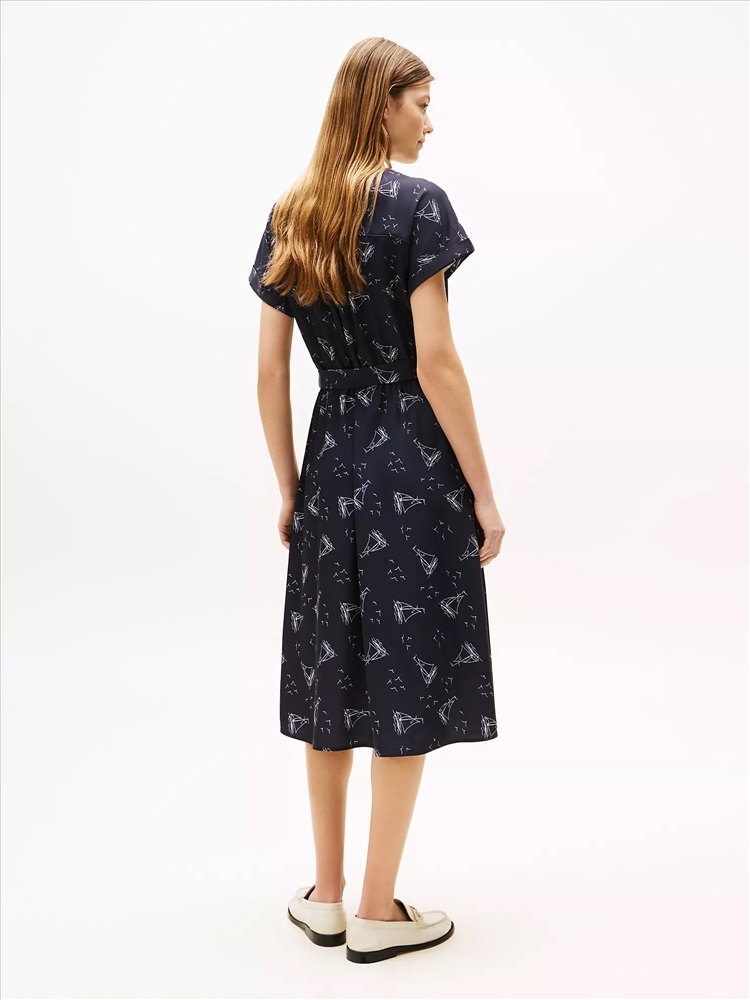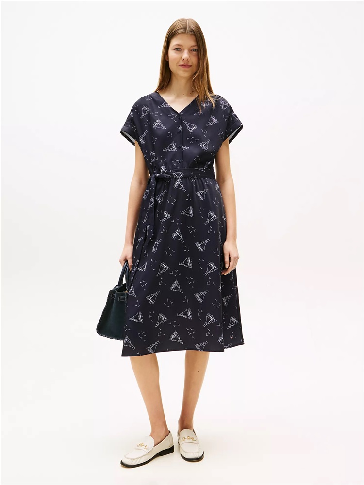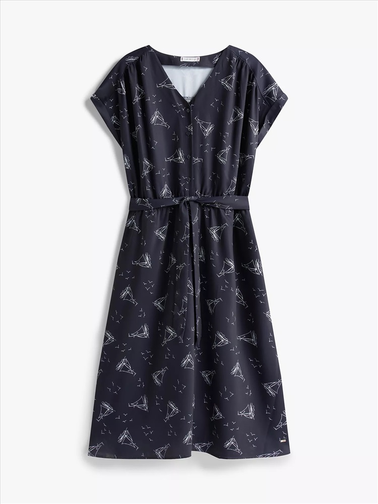Tommy Hilfiger women's dress. This breezy midi dress is made from soft, smooth crepe with a slightly textured, crinkled finish. An allover nautical print adds to the playful summer aesthetic.