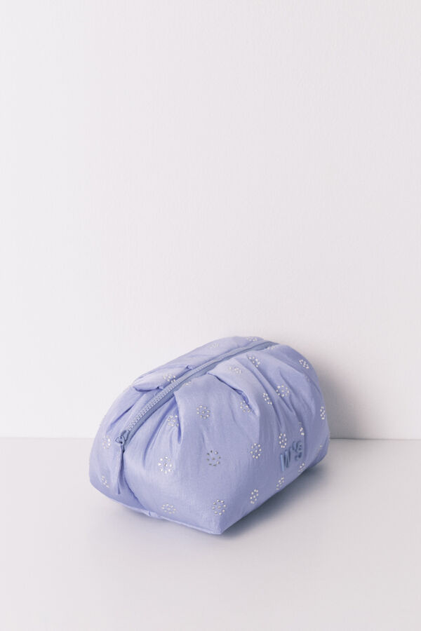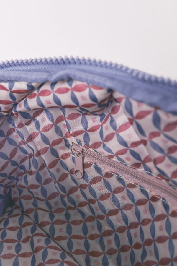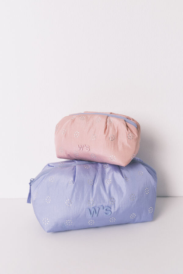 Neceser grande de tejido nylon acolchado con detalles de strass. Cierre con cremallera a contraste. El tejido interior es estampado y tiene un bolsillo extra.