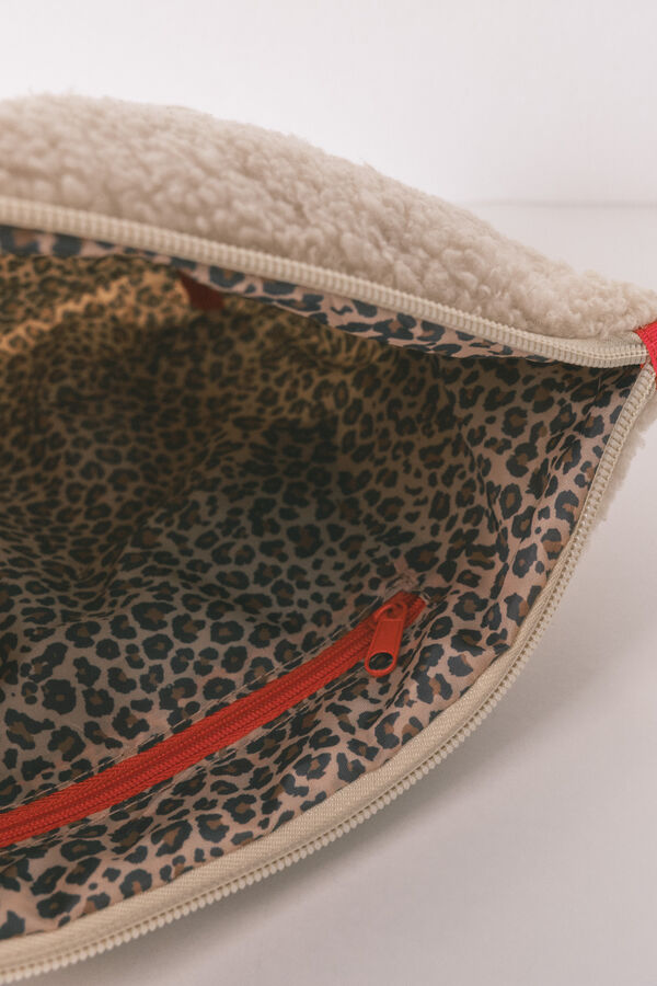 Neceser grande, acolchado en tejido borreguito y nylon, con detalle de etiqueta de Snoopy en la parte frontal. Con cierre de cremallera y prqueño monedero en animal print en el tirador. Con estampado animal print en su interiro.