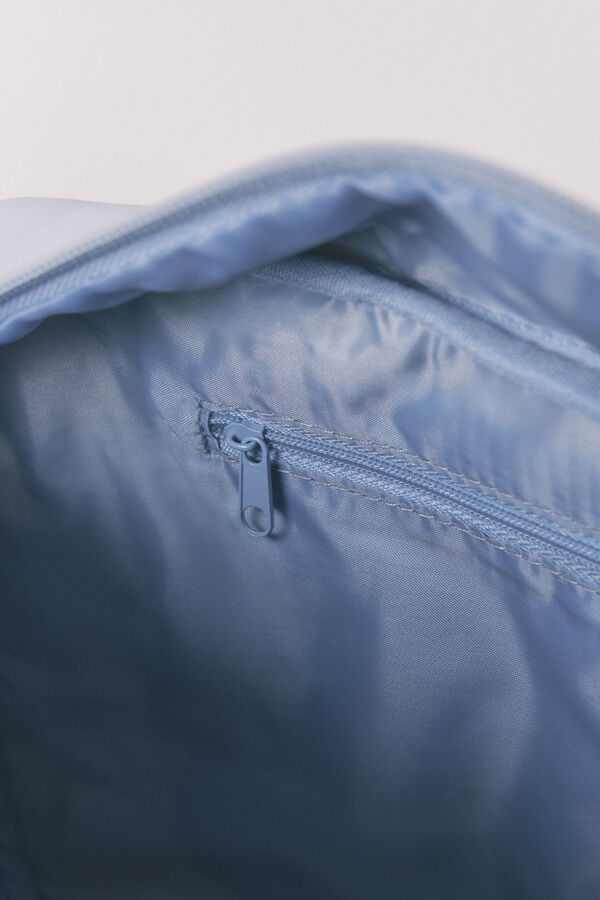Neceser grande tipo maletín en color azul con destonos en nylon acolchado y con asas a contraste en rojo. Posicionado estampado de Snoopy. Ideal para organizar tus accesorios diarios.