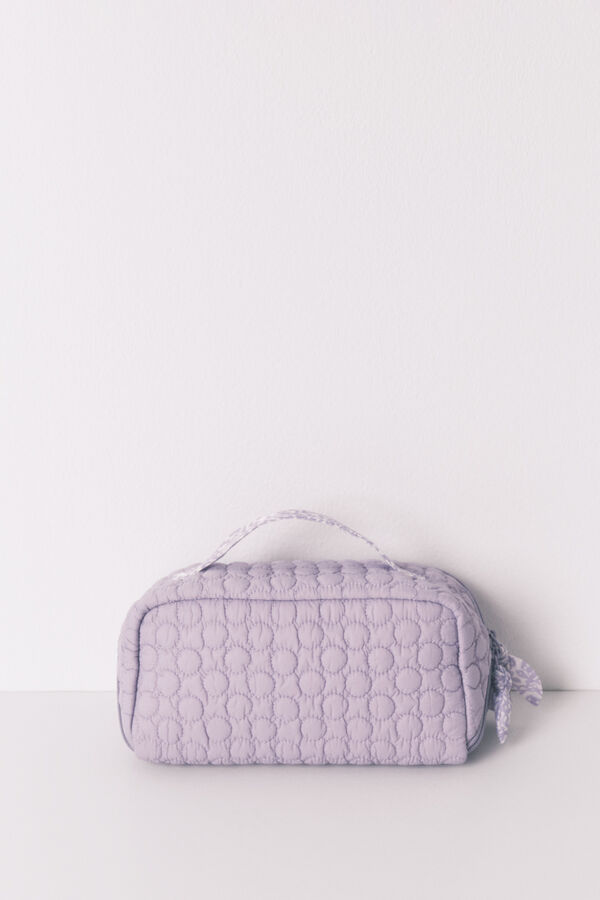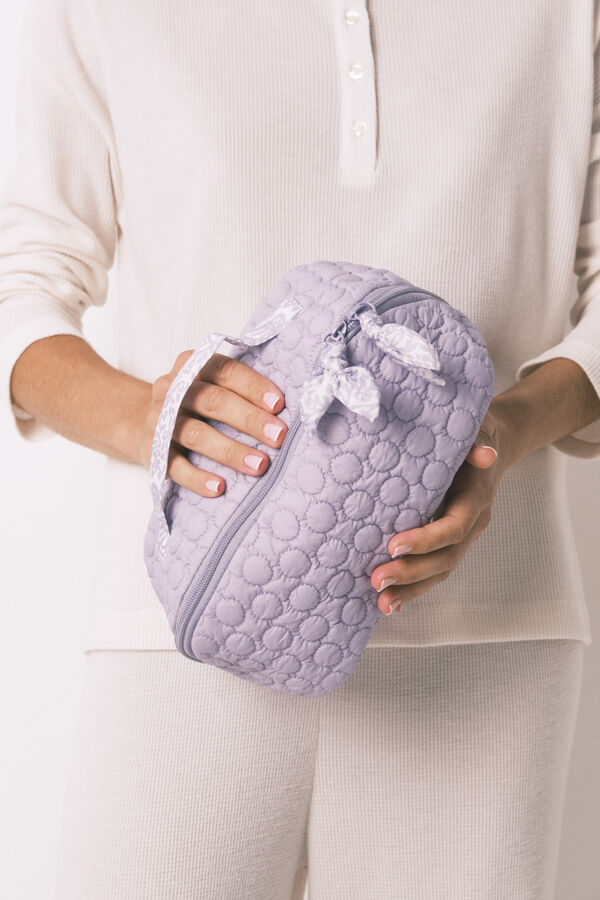 Neceser mediano, con textura en nylon acolchado. Color lila y puller estampado. Ideal para organizar tus accesorios diarios.