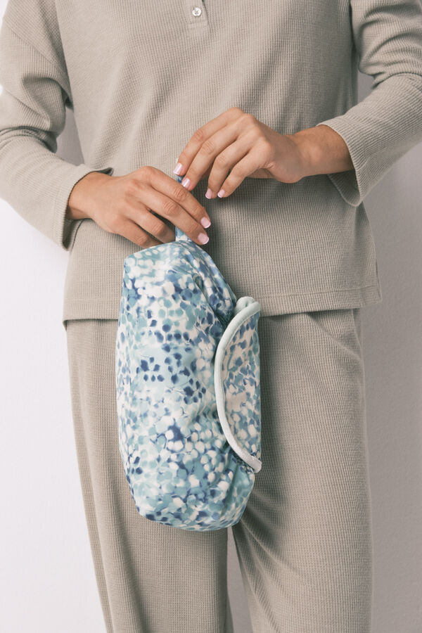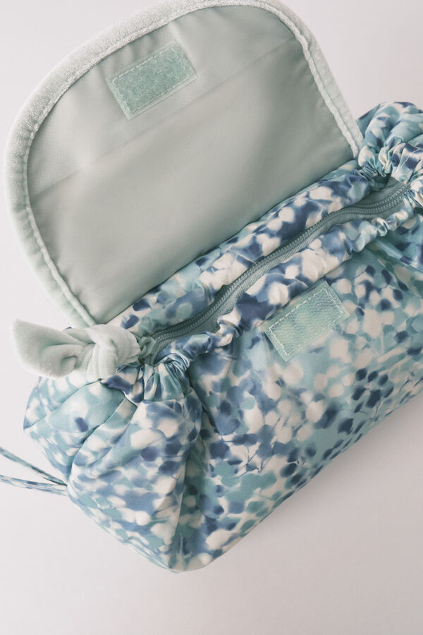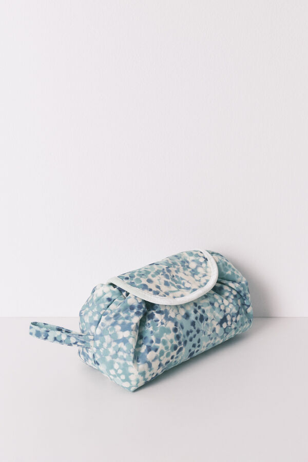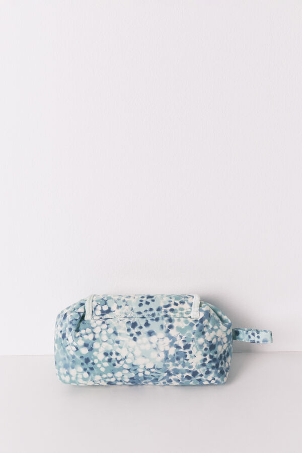 Neceser mediano, en nylon acolchado, con estampado en colores azules y verdes. Ideal para organizar tus básicos diarios.