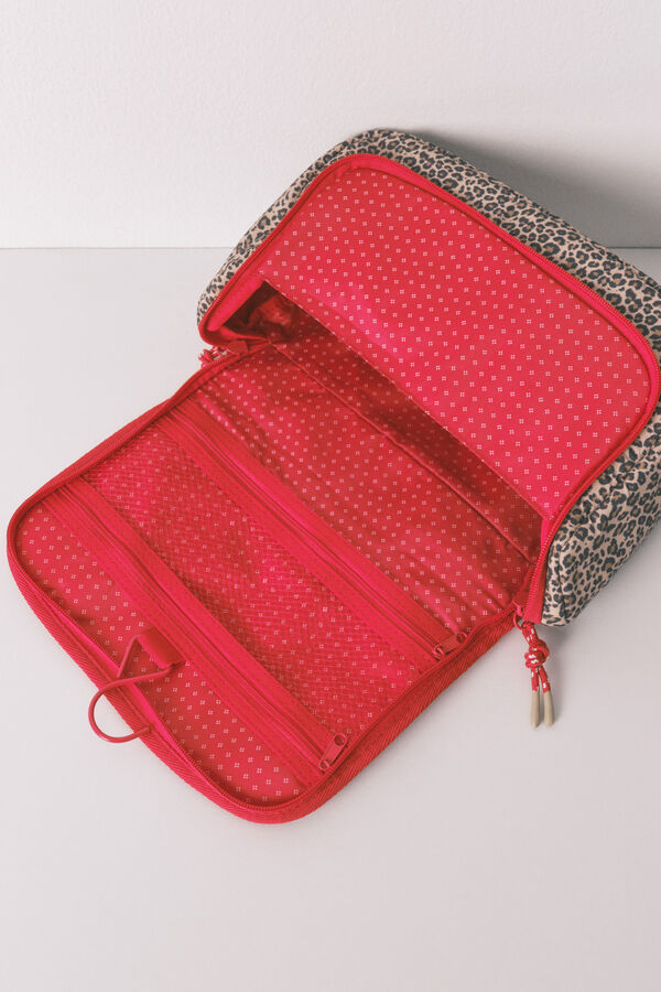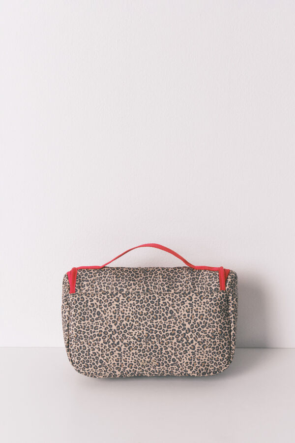 Neceser mediano, con percha para colgar, en animal print con estampado de Snoopy en la parte frontal. Con cierre de cremallera, tirador y asa a contraste. Con múltiples compartimentos en su interiro.
