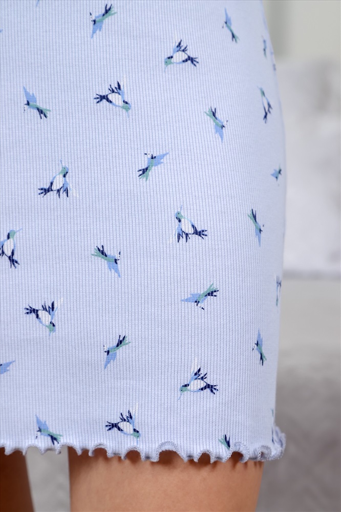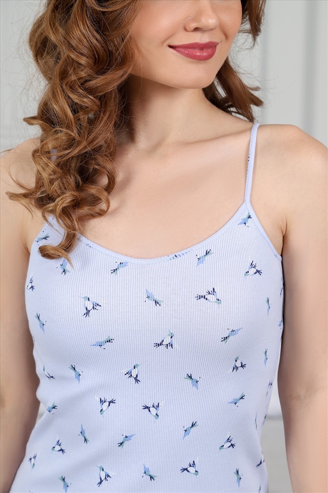 Сорочка молодежная из трикотажного полотна «кашкорсе» с набивным рисунком, слегка расширенная книзу, на узких бретелях, с V-образным вырезом спереди. Низ изделия обработан узкой обметочной строчкой, создающей красивый волнистый край.