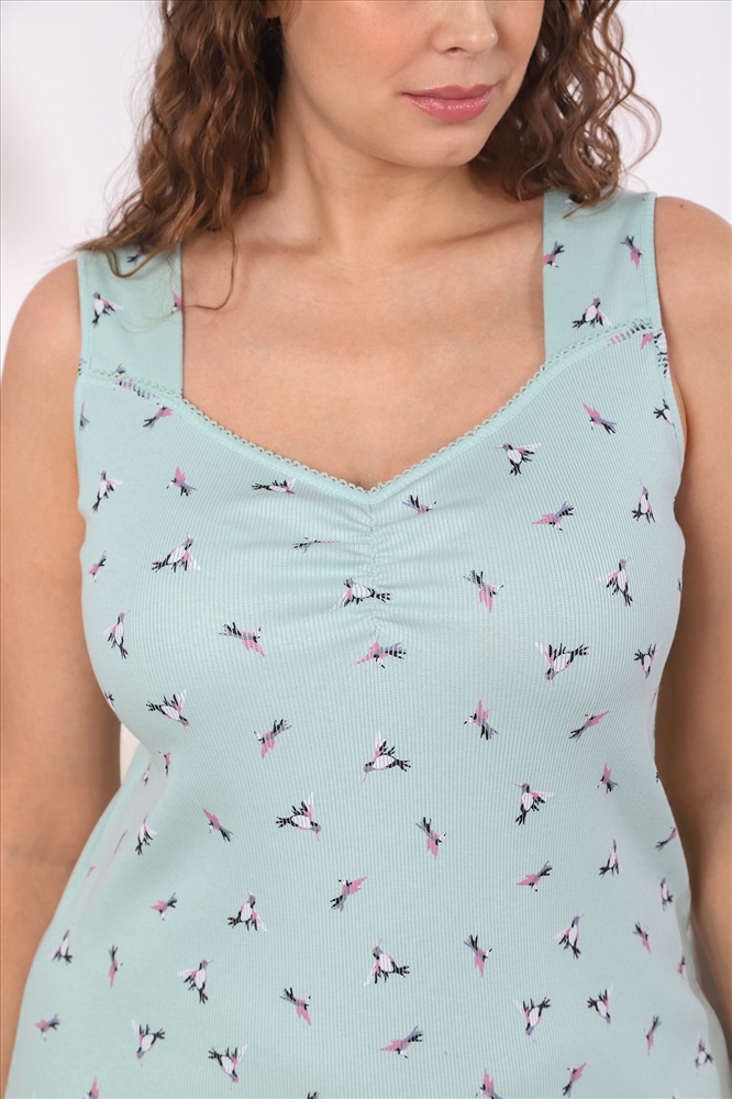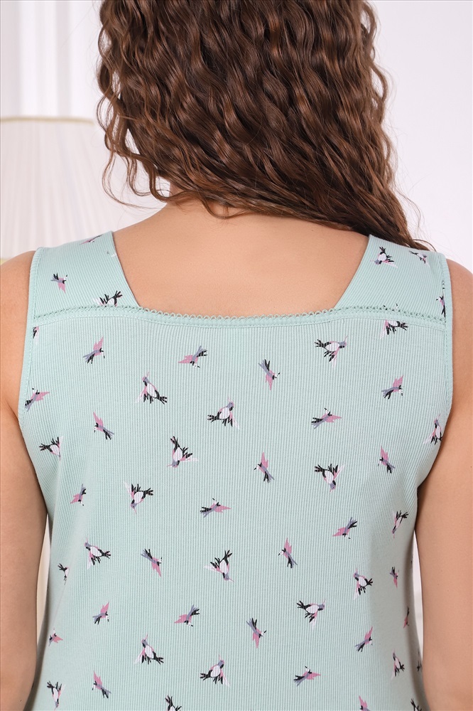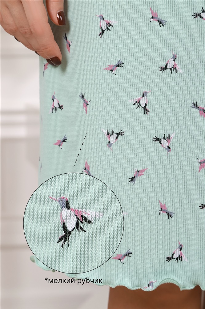 Сорочка женская из трикотажного полотна «кашкорсе» с набивным рисунком, слегка расширенная книзу, без рукавов, на широких бретелях, с горловиной V-образной формы и небольшой драпировкой в центре груди. Горловина спинки и переда окантованы основным материалом и украшены декоративной строчкой «кроше». Проймы окантованы основным материалом, низ изделия обработан узкой обметочной строчкой, создающей красивый волнистый край.