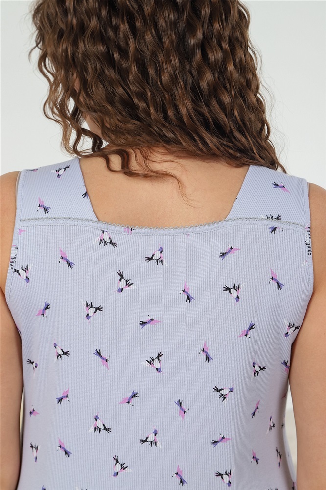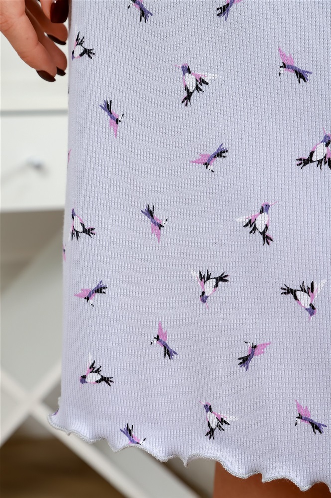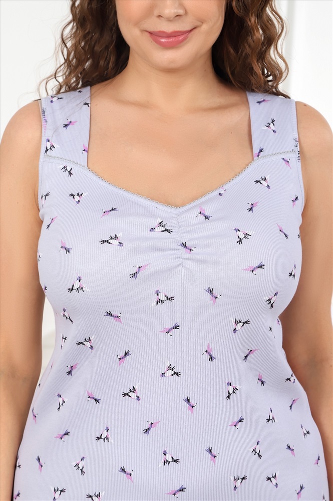 Сорочка женская из трикотажного полотна «кашкорсе» с набивным рисунком, слегка расширенная книзу, без рукавов, на широких бретелях, с горловиной V-образной формы и небольшой драпировкой в центре груди. Горловина спинки и переда окантованы основным материалом и украшены декоративной строчкой «кроше». Проймы окантованы основным материалом, низ изделия обработан узкой обметочной строчкой, создающей красивый волнистый край.