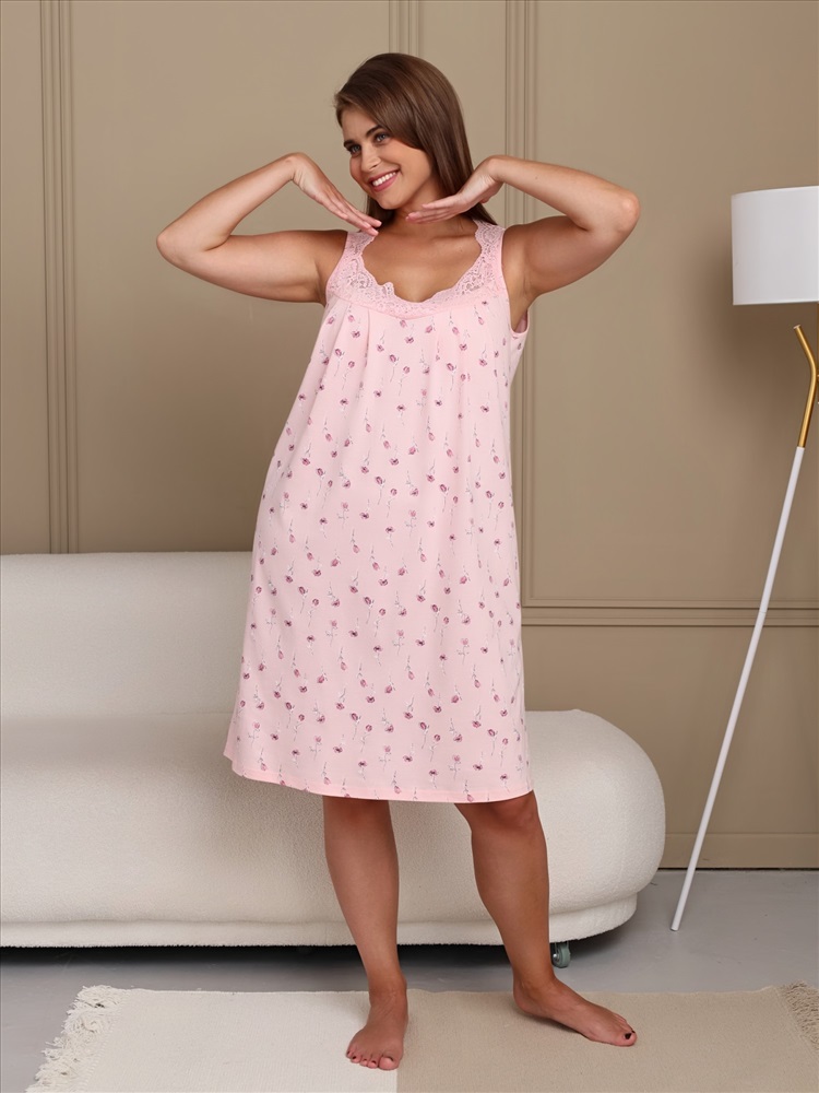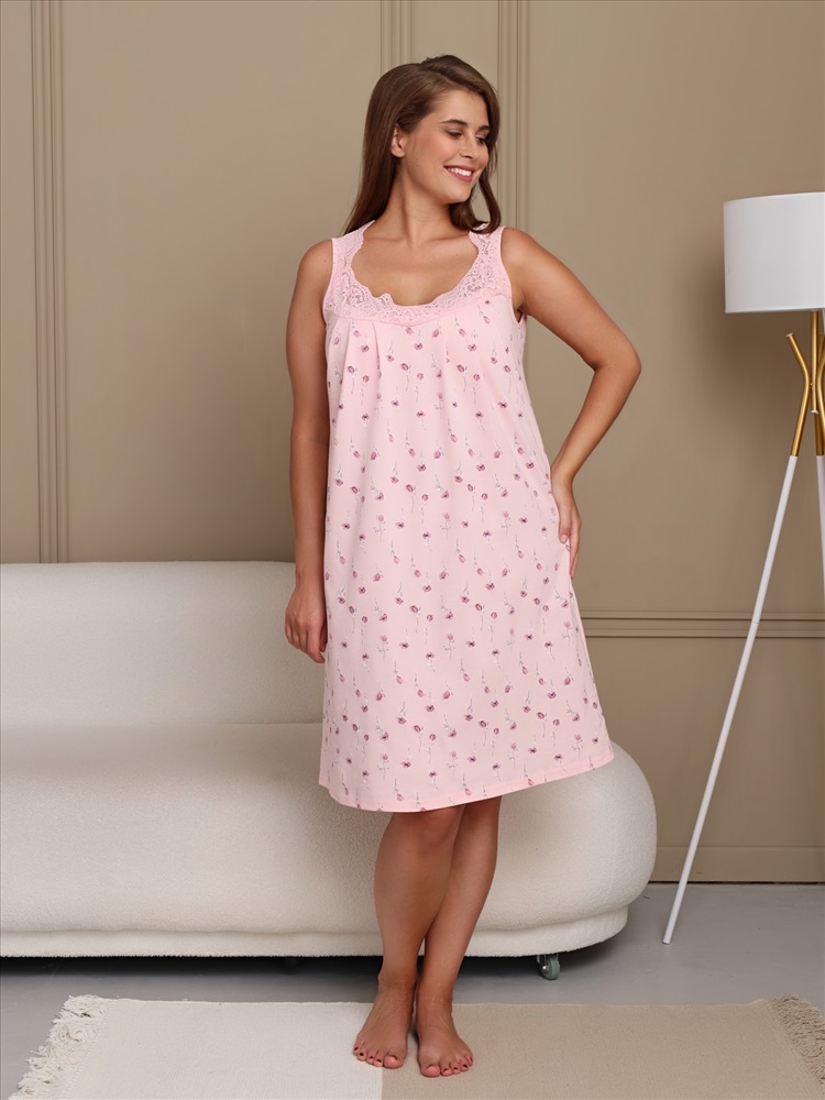 Сорочка женская из трикотажного полотна «кулирка» слегка расширенная книзу, без рукавов. Кружевные детали кокетки на полочке образуют V-ный вырез горловины. На нижней части полочки по шву притачивания кружевной кокетки заложены симметричные складки, проймы окантованы основным материалом.