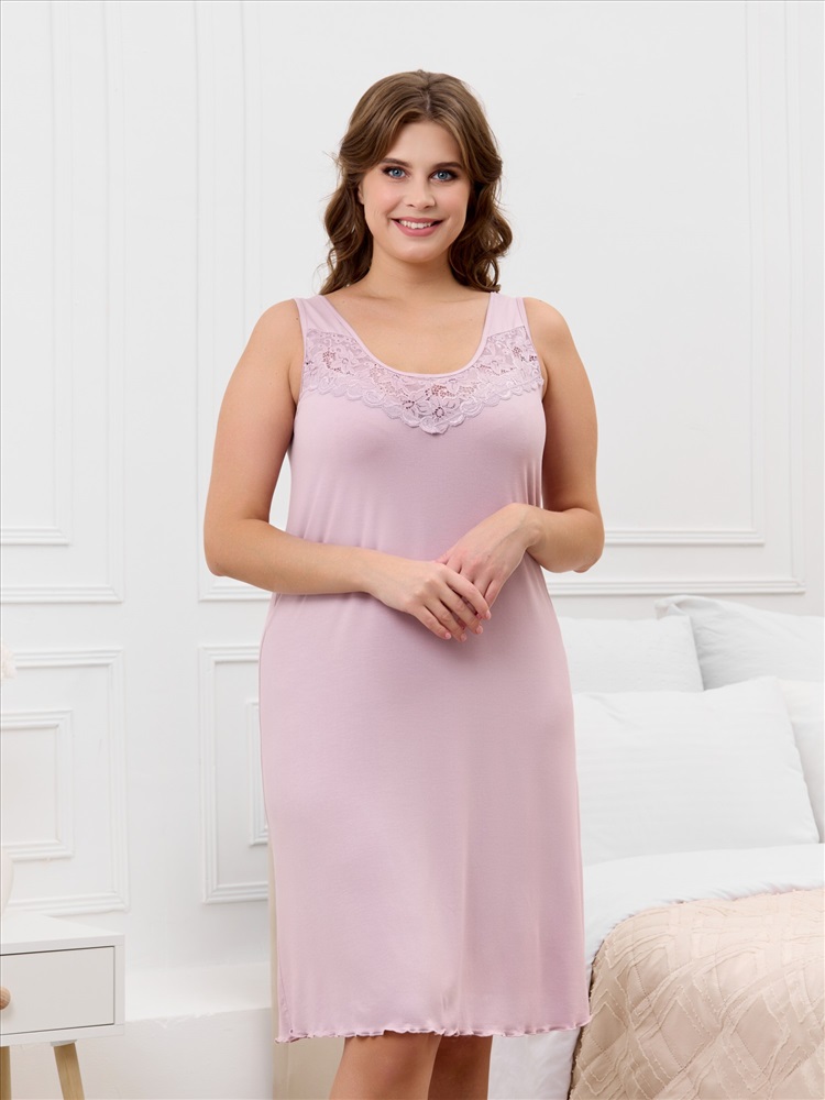Сорочка женская из гладкокрашенного трикотажного вискозного полотна, слегка расширенная книзу, без рукавов на широких бретелях, с горловиной овальной формы. На полочке V- образная притачная кокетка из кружева, на спинке - углубленный вырез с кружевной поперечной вставкой. Горловина и проймы окантованы основным материалом, низ отделан узкой обметочной строчкой, создающей волнистый край.