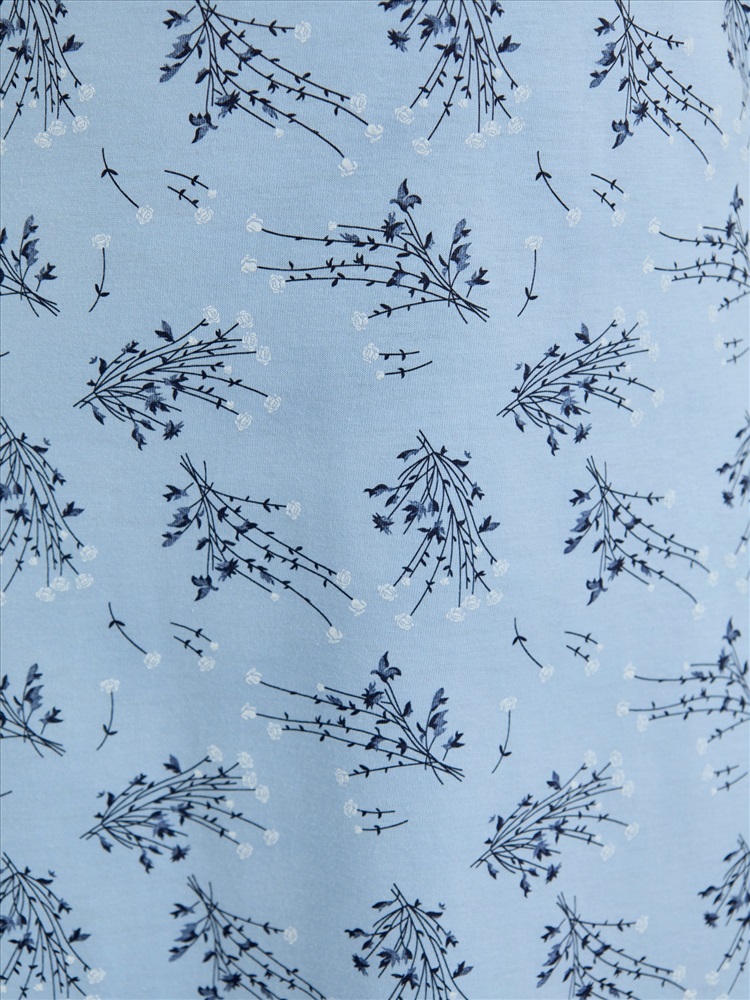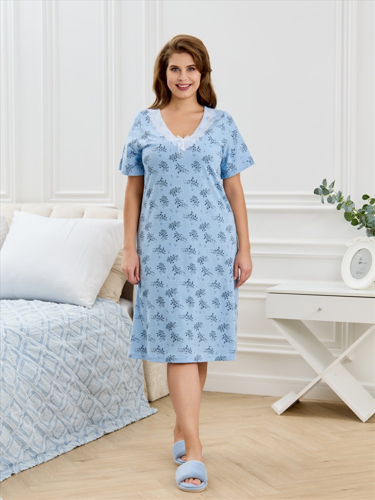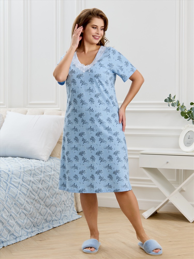 Сорочка женская из трикотажного полотна «кулирка» с набивным рисунком, полуприталенного силуэта, слегка расширенная к низу, с короткими втачными рукавами. Горловина V- образной формы, обработана кружевом с фестонным краем, по центру настрочен декоративный бантик из узкой атласной тесьмы.