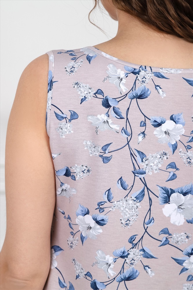 Сорочка женская из трикотажного вискозного полотна с набивным рисунком, слегка расширенная книзу, без рукавов, с кружевной вставкой-кокеткой V-образной формы и небольшой драпировкой в центре груди. Горловина и проймы окантованы основным материалом.