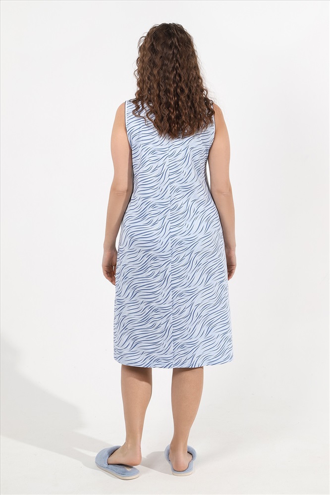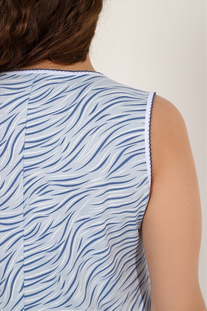 Ткань: Кулирка Кулирка - это самое гладкое и тонкое трикотажное полотно из чистого хлопка. С лицевой стороны ткань «кулирка» выглядит как «вертикальные косички», орнамент изнаночной стороны напоминает «кирпичную кладку». Свойства кулирного трикотажа- воздухопроницаемость, гигроскопичность, не теряя своей формы, практически не тянется в длину и хорошо растягивается в ширину, не образует складки. Сорочка женская из трикотажного полотна «кулирка» с набивным рисунком, слегка расширенная книзу, без рукавов, с горловиной V-образной формы, окантованной контрастным материалом и украшенной атласным бантиком по центру. Проймы и горловина обработаны декоративной строчкой «кроше».