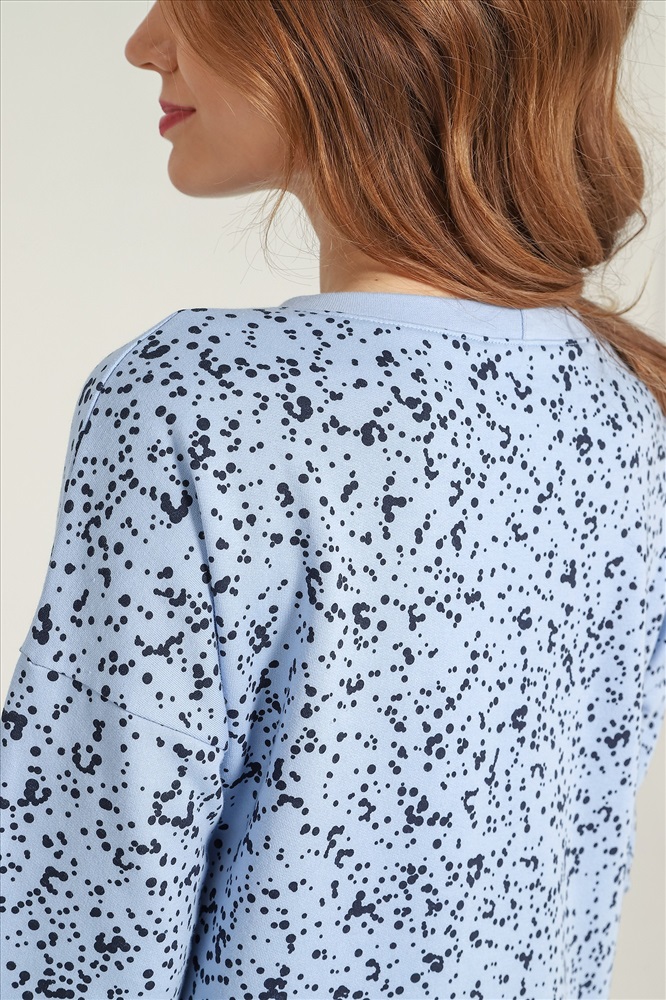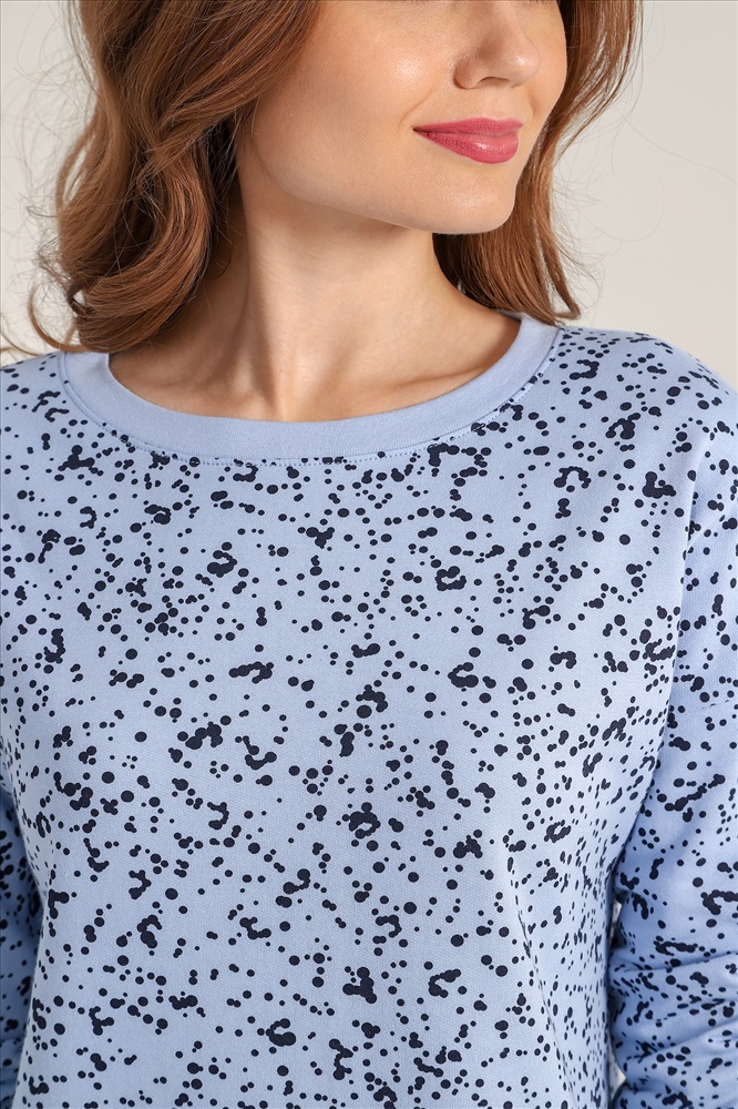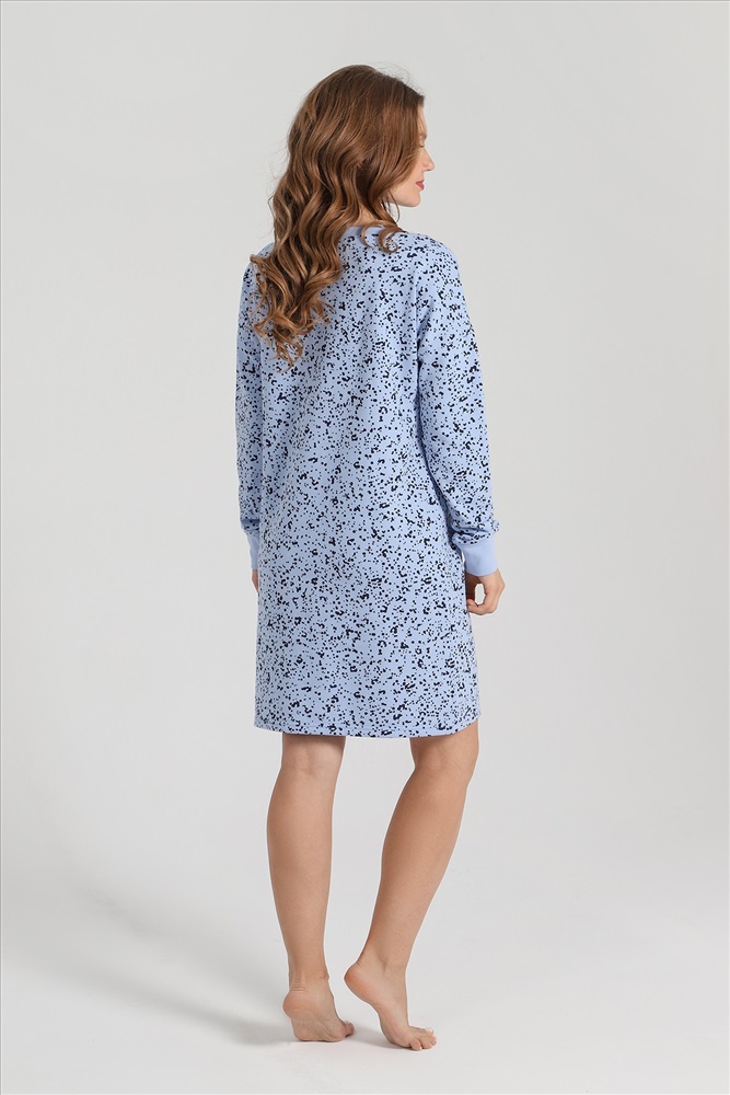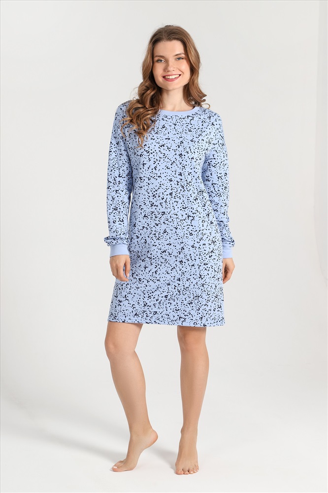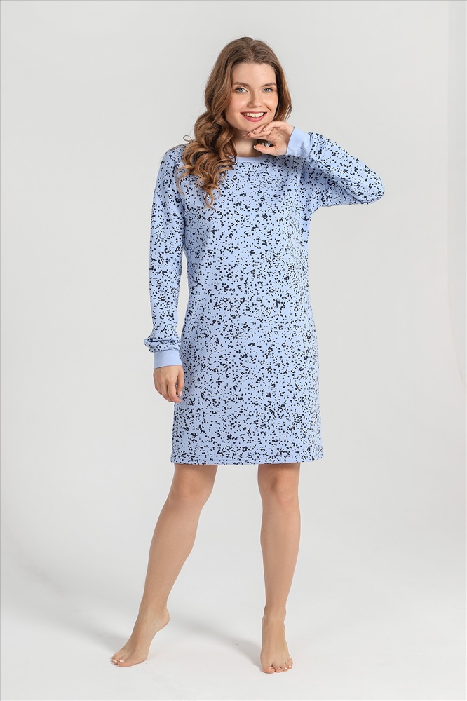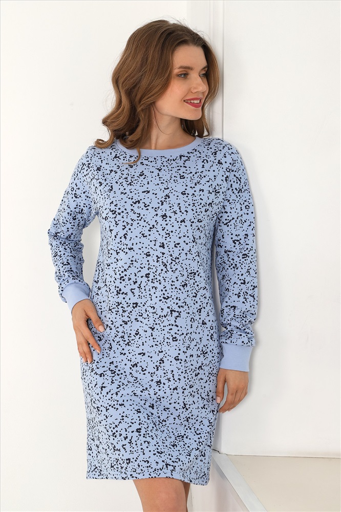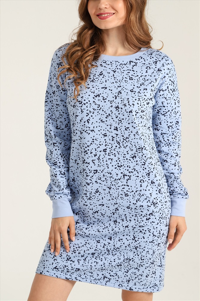 Сорочка из трикотажного полотна «футер-двунитка с начесом» с набивным рисунком, прямого силуэта, с длинными рукавами на основе цельнокроеных и овальной горловиной. Втачная бейка горловины и манжеты рукавов выполнены из эластичного полотна «рибана» в цвет основного материала.
