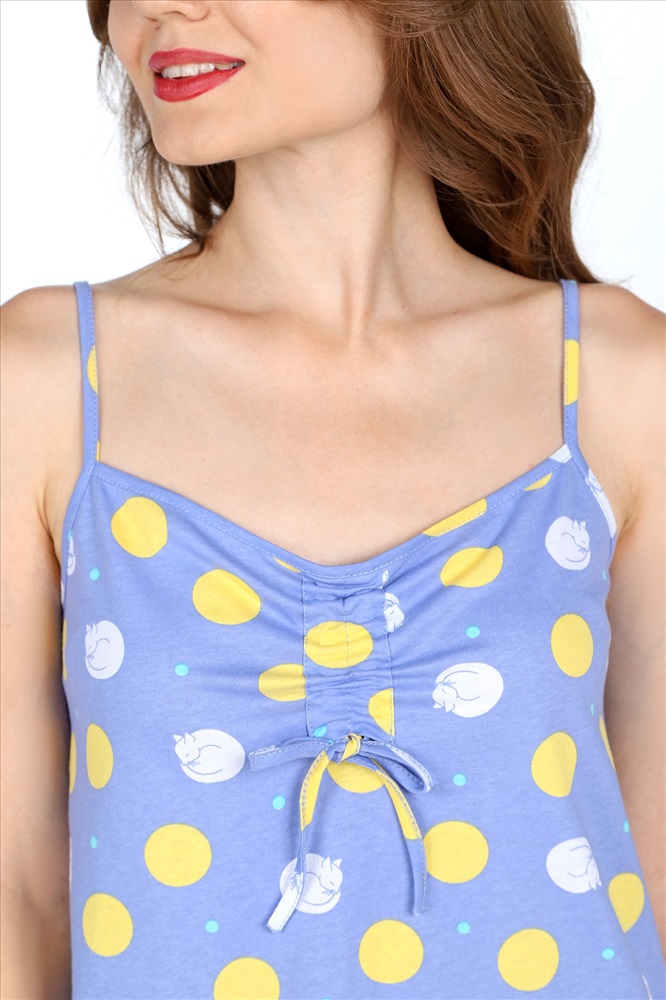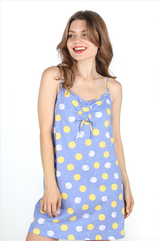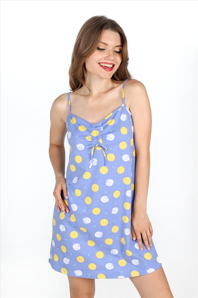 Ткань: Кулирка Кулирка - это самое гладкое и тонкое трикотажное полотно из чистого хлопка. С лицевой стороны ткань «кулирка» выглядит как «вертикальные косички», орнамент изнаночной стороны напоминает «кирпичную кладку». Свойства кулирного трикотажа- воздухопроницаемость, гигроскопичность, не теряя своей формы, практически не тянется в длину и хорошо растягивается в ширину, не образует складки. Сорочка молодежная из трикотажного полотна «кулирка» с набивным рисунком, на тонких бретелях, слегка расширенная книзу. По центру горловины переда настрочена кулиса с двумя продетыми завязками, позволяющими регулировать величину сборки.