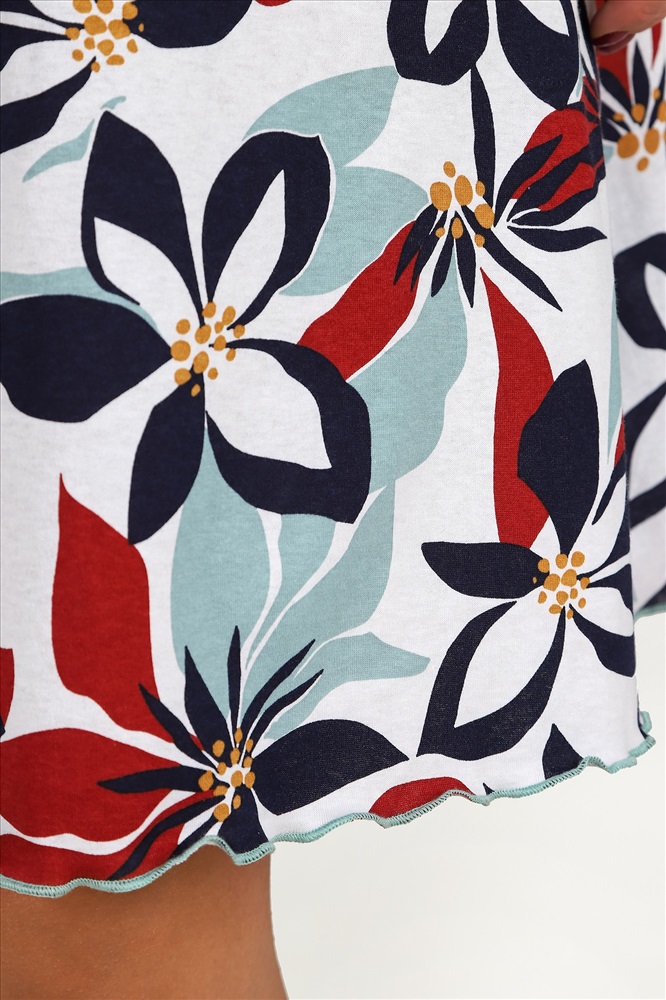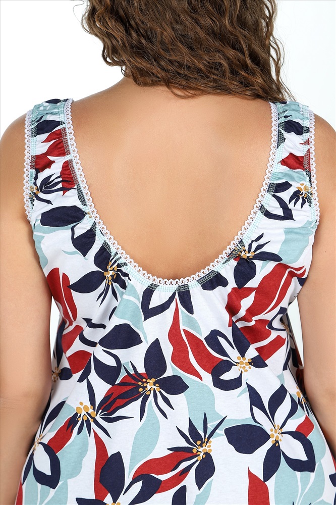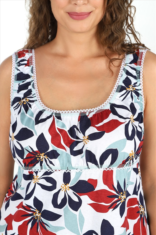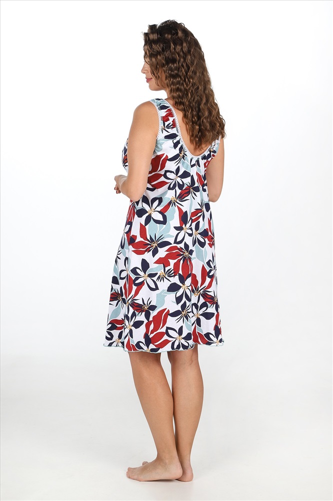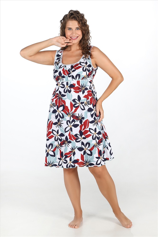 Ткань: Кулирка Кулирка - это самое гладкое и тонкое трикотажное полотно из чистого хлопка. С лицевой стороны ткань «кулирка» выглядит как «вертикальные косички», орнамент изнаночной стороны напоминает «кирпичную кладку». Свойства кулирного трикотажа- воздухопроницаемость, гигроскопичность, не теряя своей формы, практически не тянется в длину и хорошо растягивается в ширину, не образует складки. Сорочка женская из трикотажного полотна «кулирка» с набивным рисунком, расширенная книзу, без рукавов, с расширенной, углубленной горловиной овальной формы и притачной кокеткой по переду. Срезы пройм и горловины, а также шов притачивания кокетки, обработаны фасонной эластичной тесьмой с кружевным краем. Низ изделия обработан узкой обметочной строчкой.