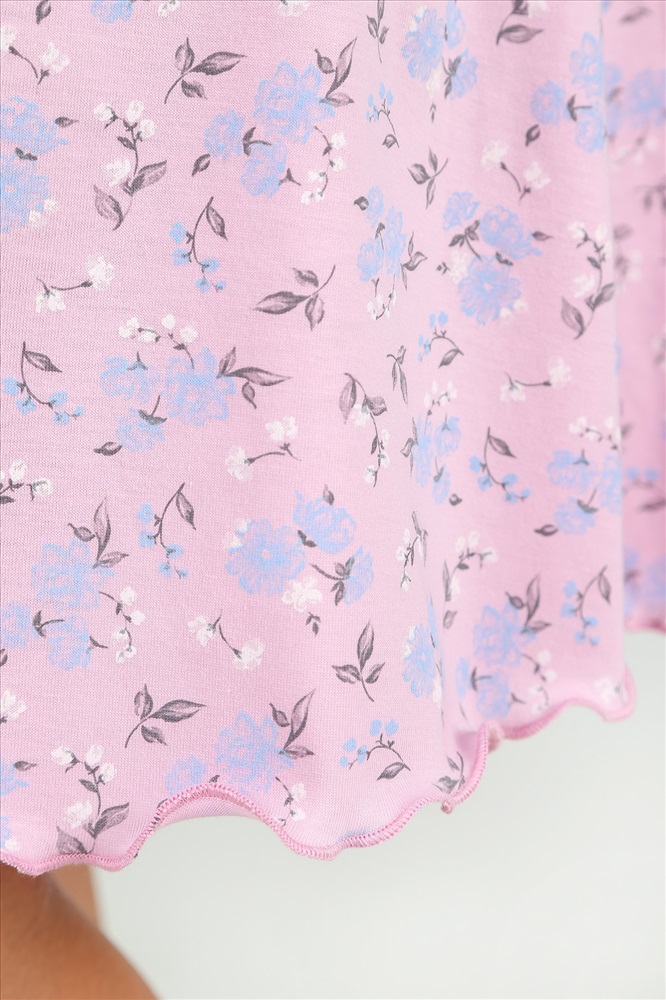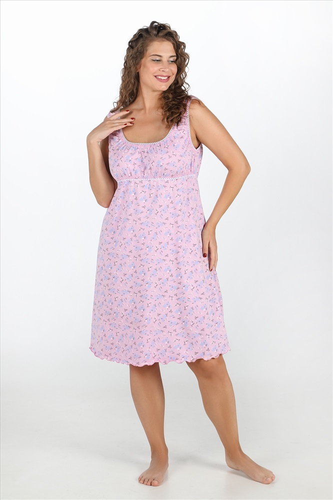 Сорочка женская из трикотажного полотна «кулирка» с набивным рисунком, расширенная книзу, без рукавов, с расширенной, углубленной горловиной овальной формы и притачной кокеткой по переду. Срезы пройм и горловины, а также шов притачивания кокетки, обработаны фасонной эластичной тесьмой с кружевным краем. Низ изделия обработан узкой обметочной строчкой.