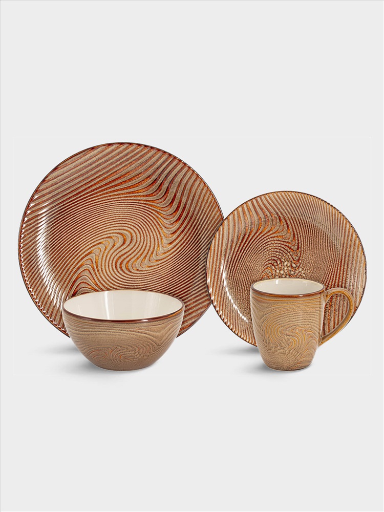 Бренд: HOME & STYLE Набор обеденный 16 пр "Махагон" ( 4 тарелки обед. 27.5см, 4 тарелки закус. 21.5см, 4 салатника 15.5см, 4 кружки 0.4л). Материал: керамика каменная. Мыть тёплой водой с применением жидких моющих средств и в посудомоечной машине. Можно использовать в СВЧ.