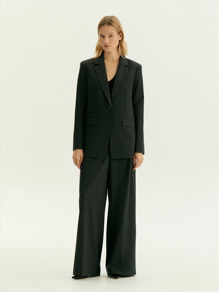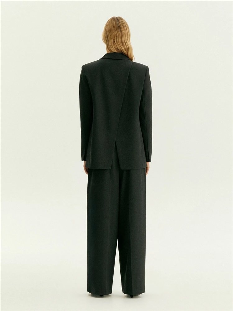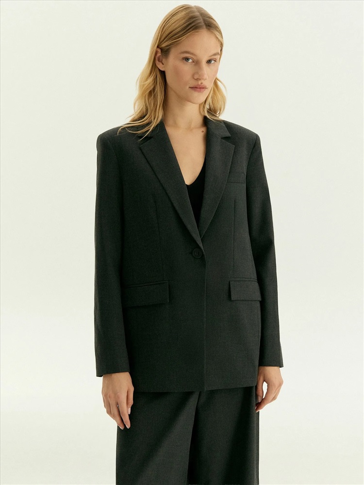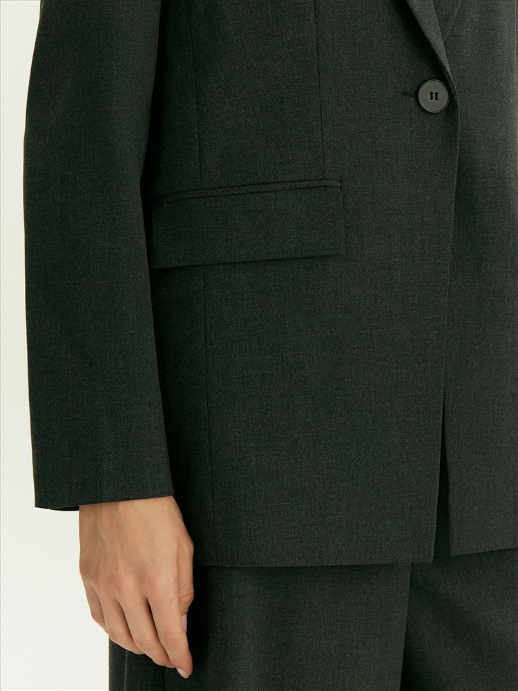 Модный жакет в тёмно-сером цвете для деловых и торжественных образов. На спинке выполнена элегантная шлица-"ласточка", которая стала главной изюминкой вещи. Удлинённая модель прямого кроя на одной пуговице, с глубоким треугольным вырезом смотрится актуально. Острые и длинные лацканы, широкие прямоугольные клапаны на карманах придают образу собранности. Жакет можно носить с брюками из комплекта и любым другим базовым низом. Изделие выполнено из материала с содержанием вискозы.