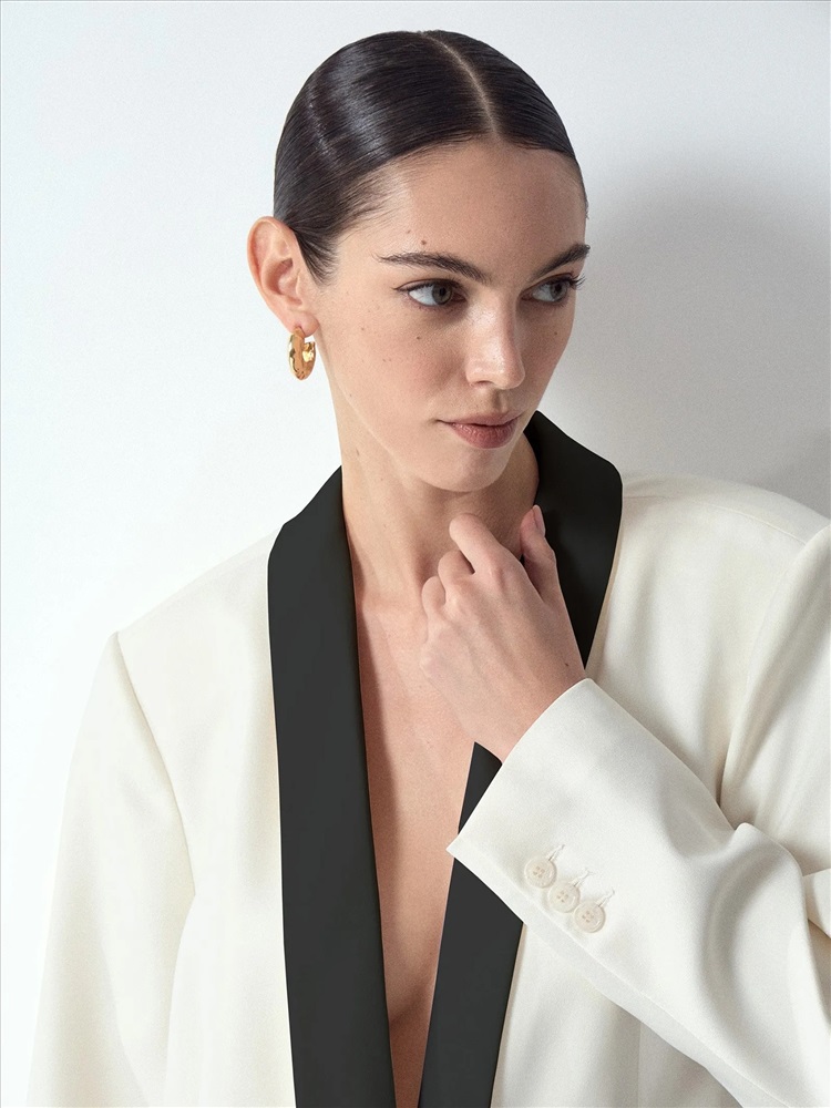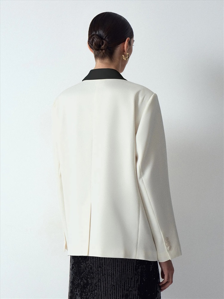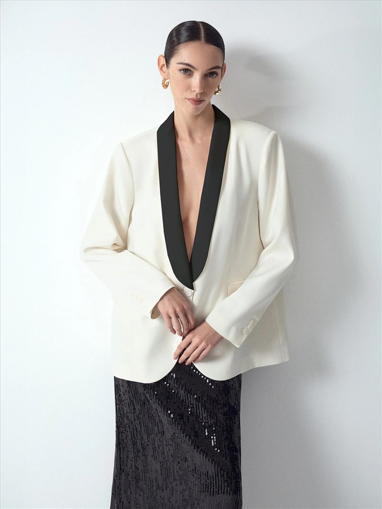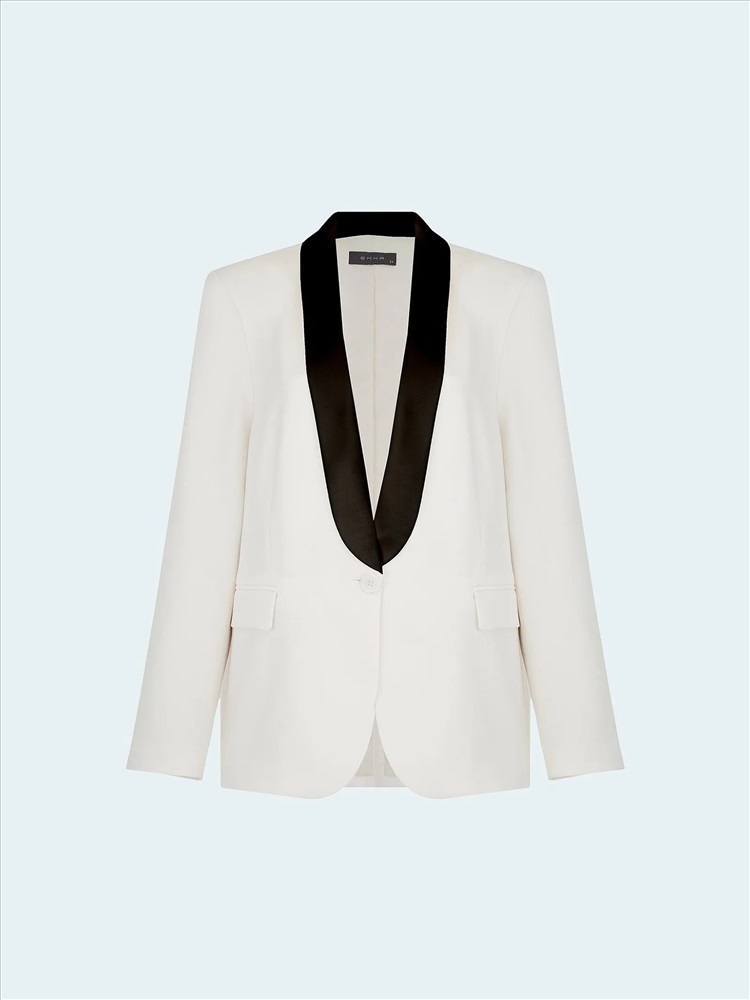 Однобортный жакет-смокинг в стиле Марлен Дитрих с контрастным шалевым воротником — это элегантная классика, приправленная лёгкой ноткой дерзости. Жакет станет идеальным вариантом, если не хочется сильно отступать от делового стиля и в то же время нужно выглядеть эффектно. Его также можно вписать в стиль спорт-шик, добавив к дениму или расслабленным брюкам на резинке. Для большей утонченности образ с жакетом можно усложнить аксессуарами: например, ниткой жемчуга. Изделие выполнено на подкладке с содержанием вискозы.