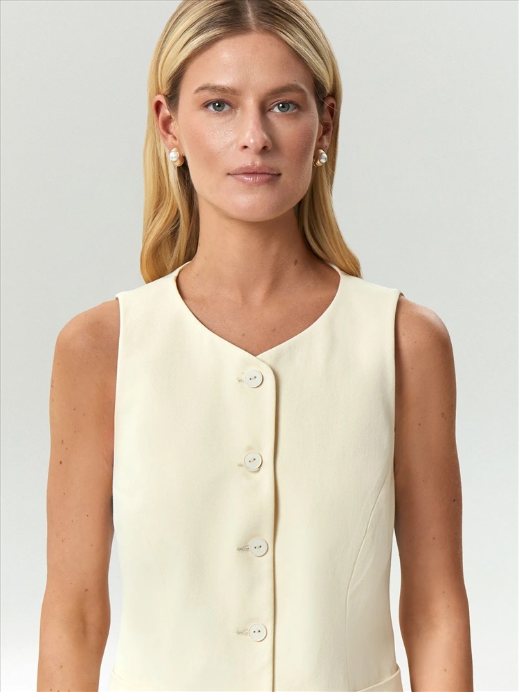 Длина: 58 см. Цвет: молочный Силуэт: приталенный Сезон: мульти Рукав: без рукава Застёжка: пуговицы Подкладка: 65% полиэстер, 35% хлопок Рост модели: 175-178 См 100% хлопок Комментарии к товару