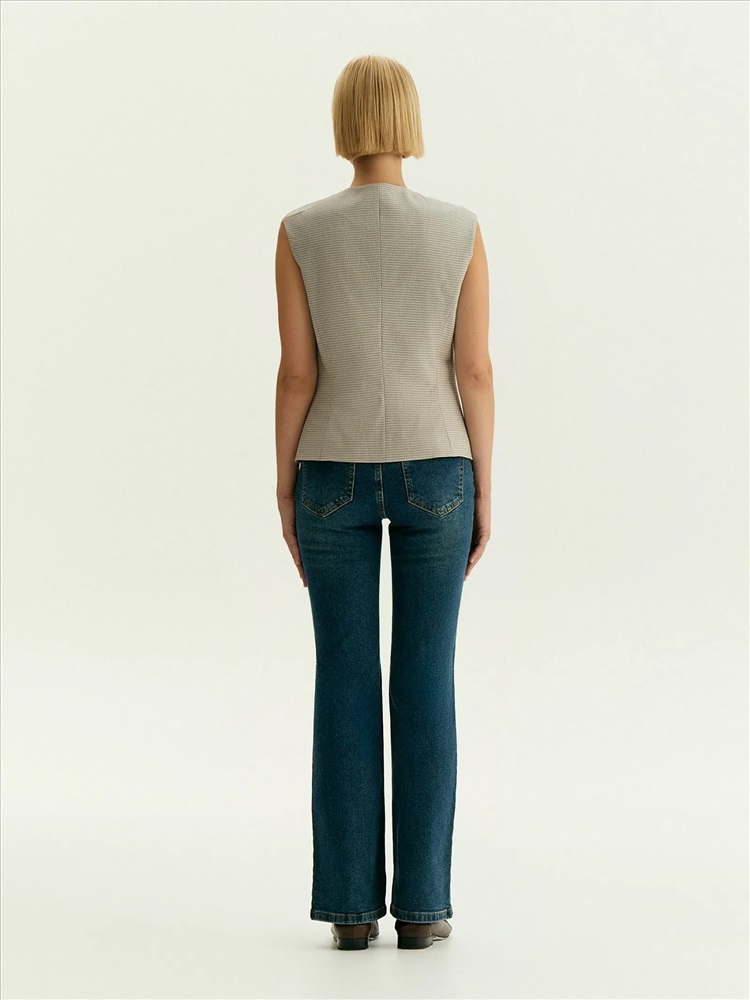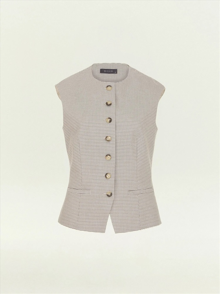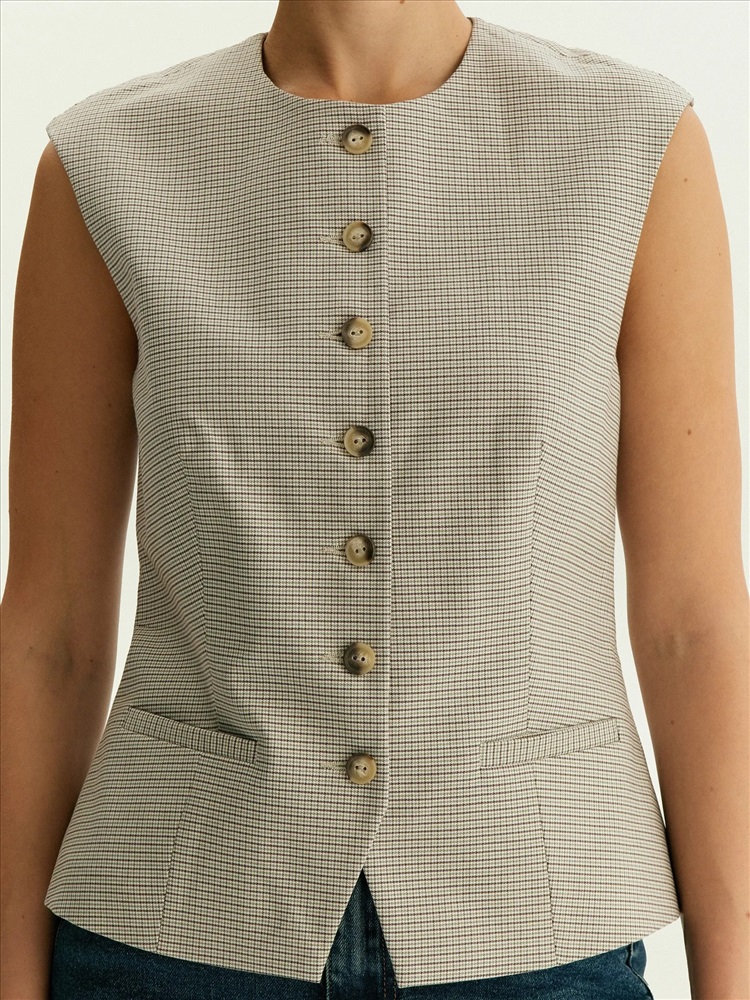 Хлопковый жилет в гусиную лапку и с пуговицами под рог сделает более концептуальными повседневные и деловые образы. Ряд пуговиц идёт от горловины до низа, а вырез сделан под горло, что добавляет нотку интеллектуальной строгости. Лёгкая приталенность адаптирует идею фасона "с мужского плеча" под изящную женскую фигуру. Дополнить образ можно синими, серыми или коричневыми джинсами, лаконичными тёмно-серыми брюками и другими вариантами низа. Жилет сделан на подкладке с хлопком.