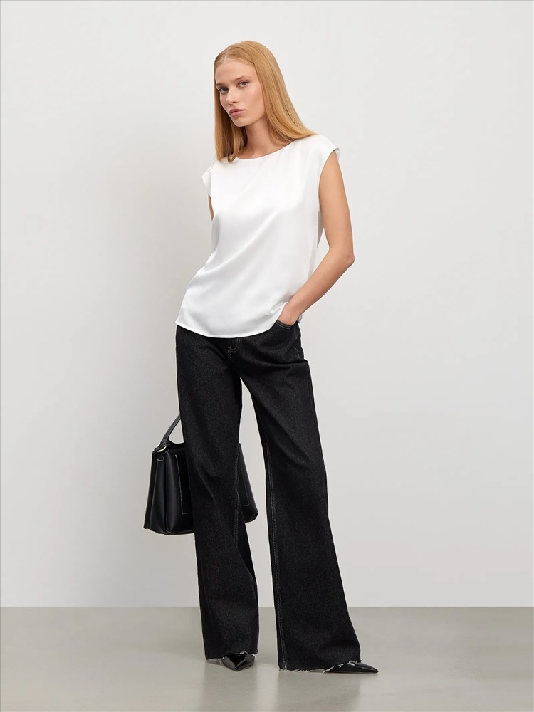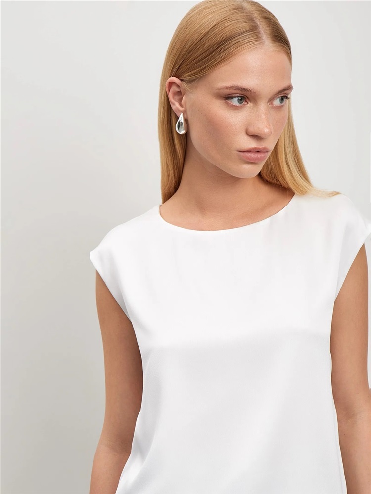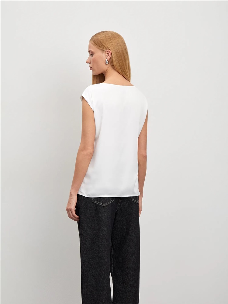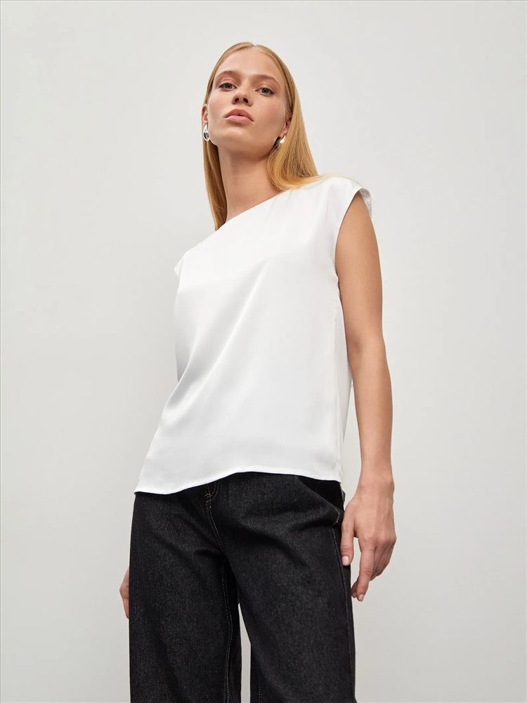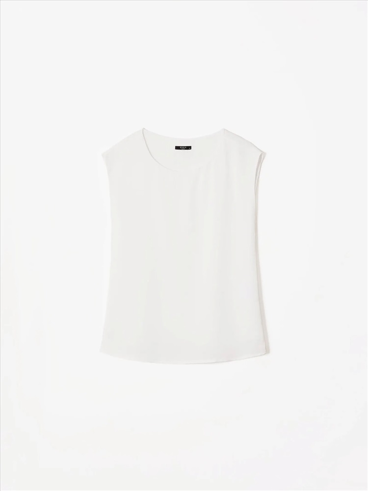 Базовый молочный топ без рукавов. Выполнен из мягкой и приятной к телу ткани с содержанием вискозы. Прямой силуэт подойдёт любому типу фигуры. Овальный вырез изделия открывает вид на ключицы и шею. Топ станет лаконичным дополнением к деловым и ежедневным образам.