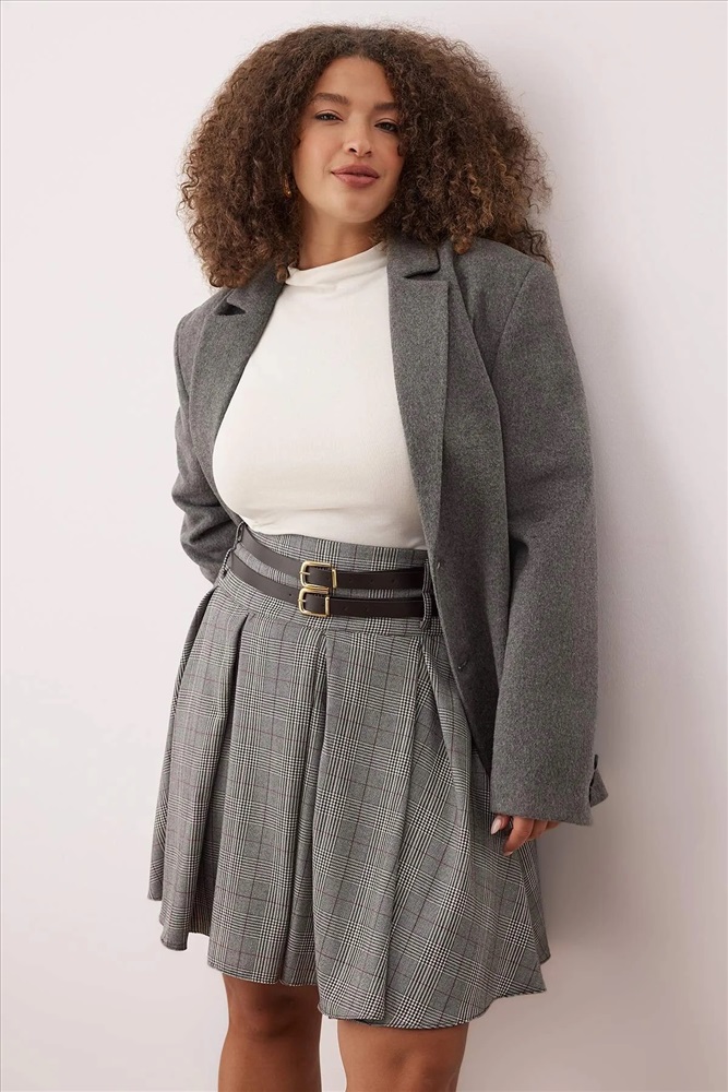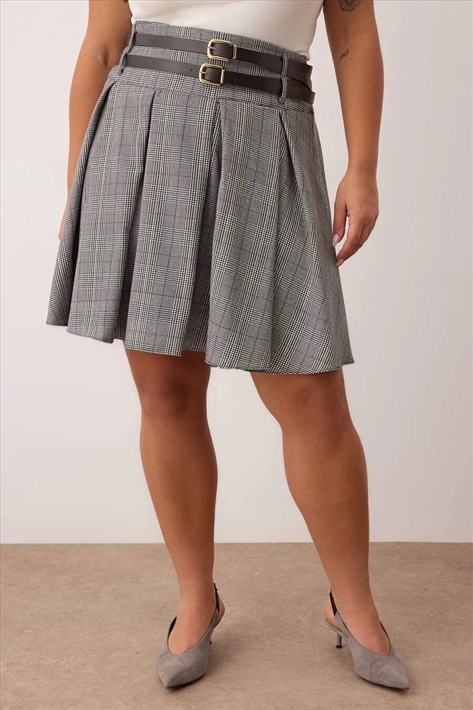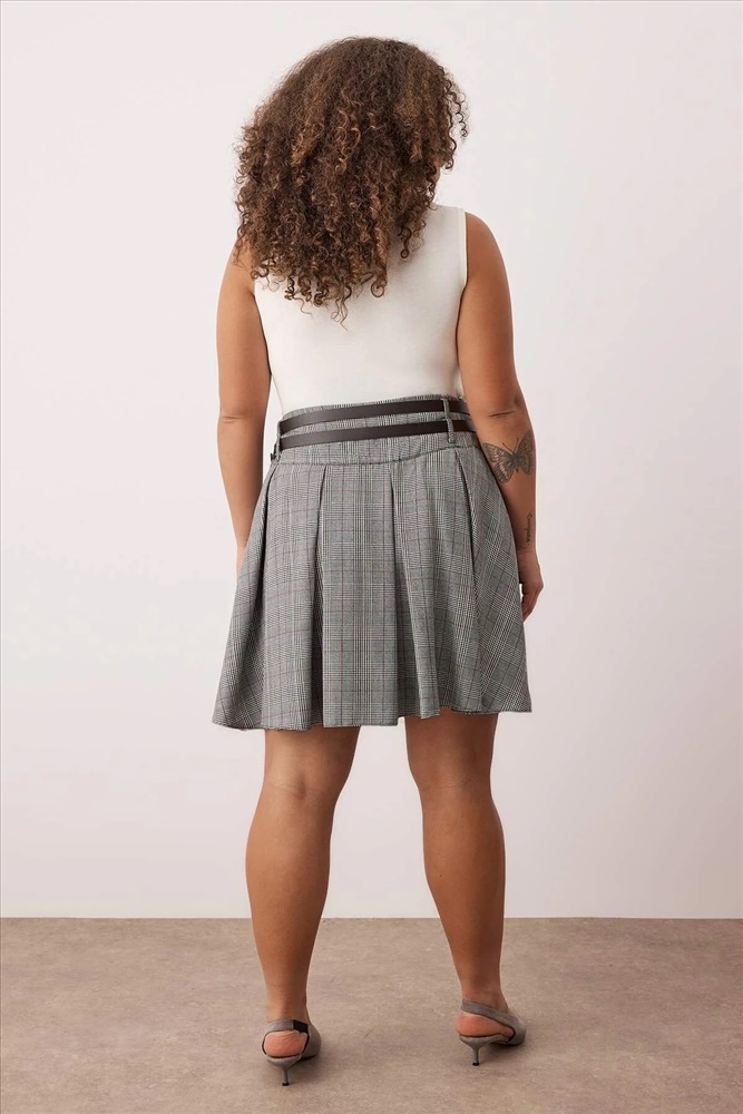 Çok Renkli Ekose/Kareli Kemerli Dokuma Mini Büyük Beden Etek TBBAW26AZ00017