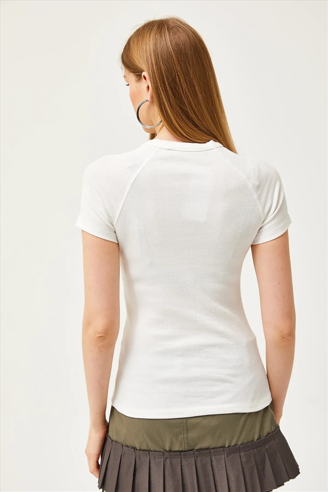Olalook Kadın Beyaz Düğmeli Reglan Kısa Kol Bluz BLZ-19002590