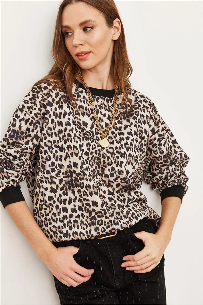 Olalook Kadın Ekru Leopar Basic Yumuşak Dokulu Salaş Sweatshirt SWT-19000457