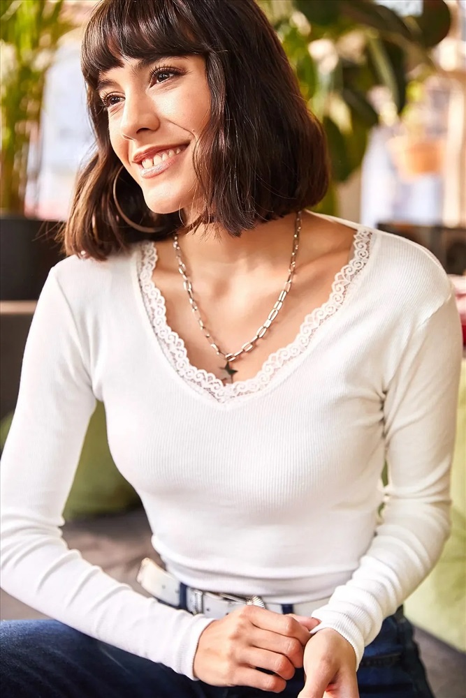 Olalook Kadın Ekru Yaka Dantelli V Yaka Kaşkorse Örme Bluz BLZ-19001713
