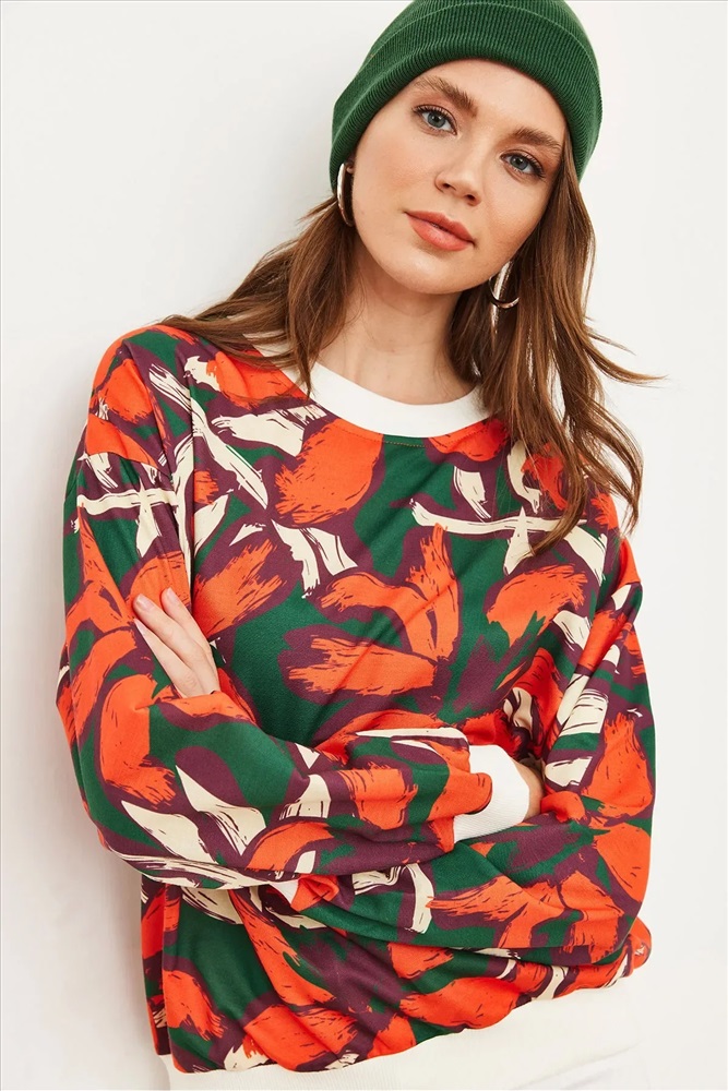 Olalook Kadın Turuncu Yeşil Basic Yumuşak Dokulu Salaş Sweatshirt SWT-19000457