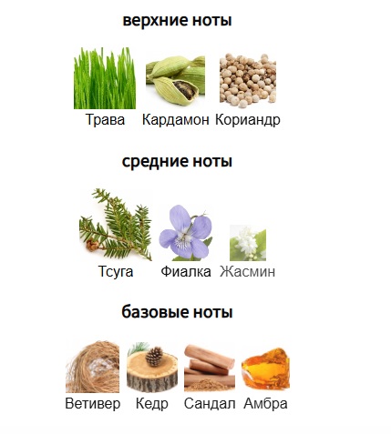 Верхние ноты: Трава, Кардамон и Кориандр; средние ноты: Тсуга, Фиалка и Жасмин; базовые ноты: Ветивер, Кедр, Сандал и Амбра.