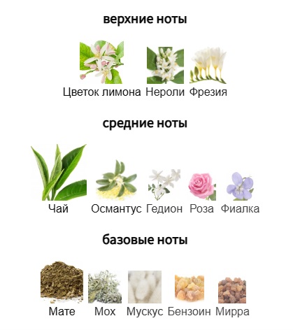 Верхние ноты: Цветок лимона, Нероли и Фрезия; средние ноты: Чай, Османтус, Гедион, Роза и Фиалка; базовые ноты: Мате, Мох, Мускус, Бензоин и Мирра.