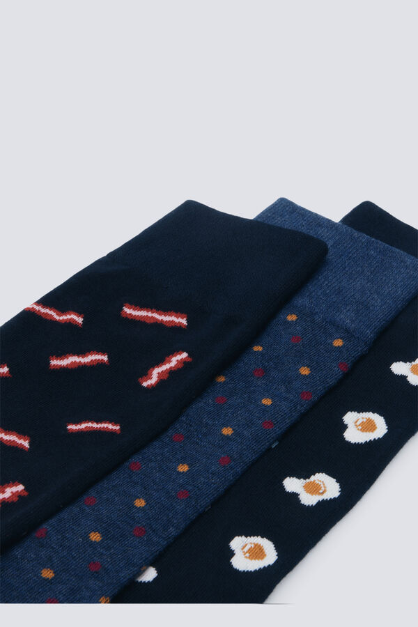 Pack 3 calcetines altos en algodón con jacquard de huevos, puntos y bacón.