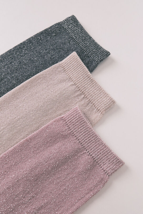 Pack de 3 calcetines largos, confeccionados con algodón, en tres colores diferentes: rosa, beige y gris, con detalles de lurex. Deja que se vean en tus looks más “cool”.