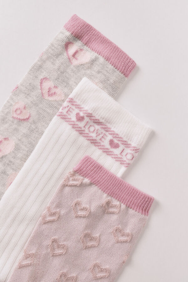 Pack de 3 calcetines largos con estampado de corazones, fabricados en algodón suave y elástico. Diseñado para ofrecer comodidad y estilo durante tus actividades diarias.