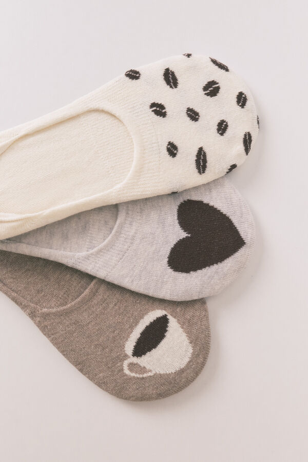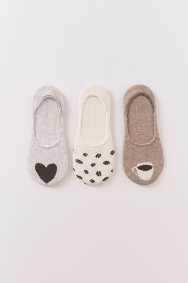 Pack de tres calcetines slip on con estampado de café en tonos marrones, fabricados en algodón suave y elástico. Diseñado para ofrecer comodidad y estilo durante tus actividades diarias.