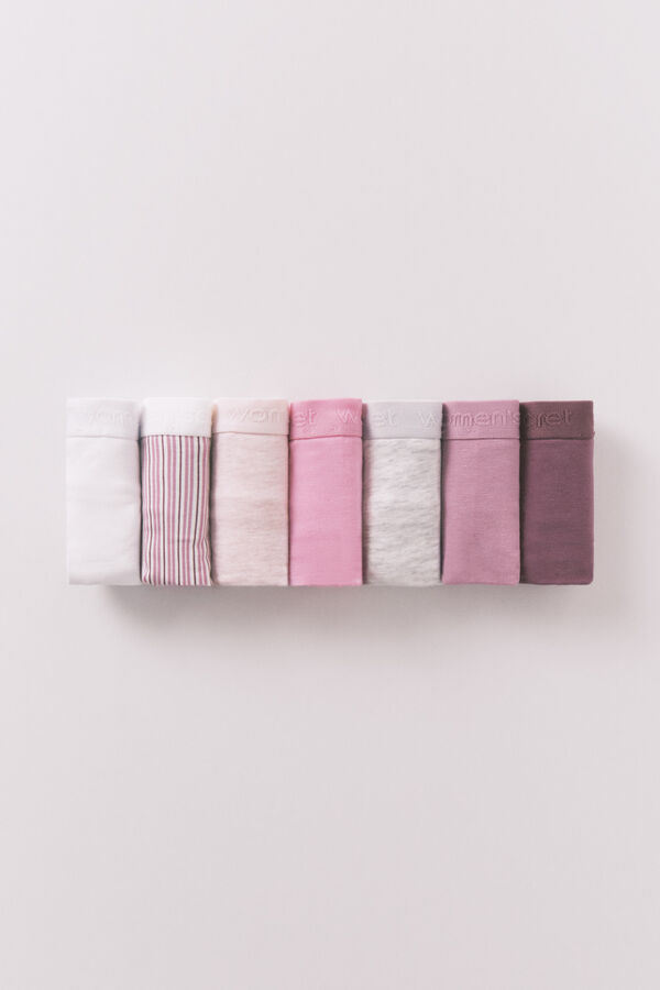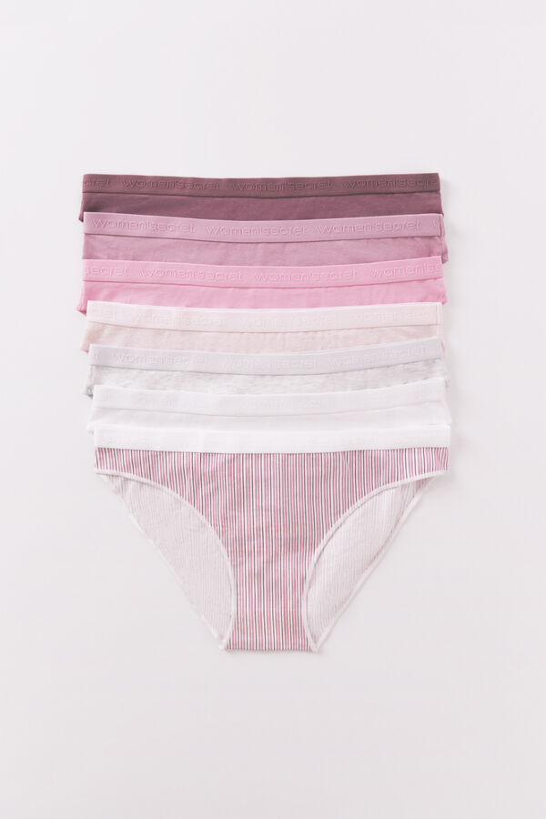 Pack de 7 bragas clásicas de algodón, todas lisas excepto una con estampado de rayas y goma a tono con nuestro logo. Perfectas para toda la semana. Combínalas con la parte de arriba que más te guste para lucir el conjunto (o des- conjunto) completo.