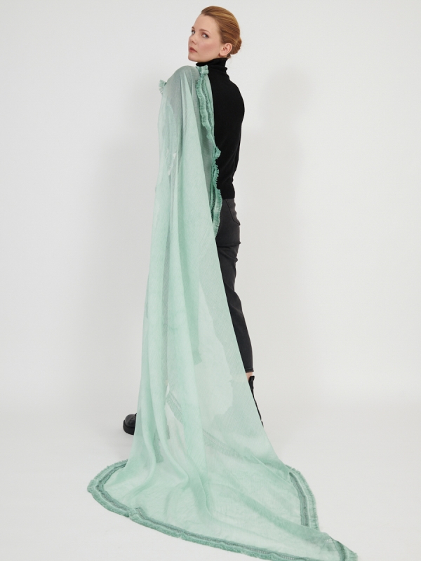 Цвет: Мята Большой красивый палантин из жатой ткани,за счет чего изделие пружинит,его легко можно сделать большим или маленьким. Все полотно палантина по периметру украшено красивой бахромой, окрашенной в тон основной ткани. Только ручная стирка. Нельзя гладить!