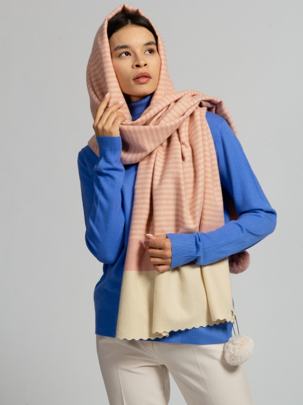 Размер: 200 х 55 см Состав: Вискоза, Шерсть, Модал Состав: Шерсть 20% Вискоза 45% Модал 35% Цвет: Молочный, Розовый Принт: Полоска Большой, мягкий, теплый двусторонний палантин с рисунком в стиле арт-деко. Края изделия украшены съемными помпонами из меха кролика. Только ручная стирка. Комментарии к товару