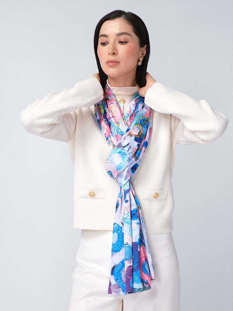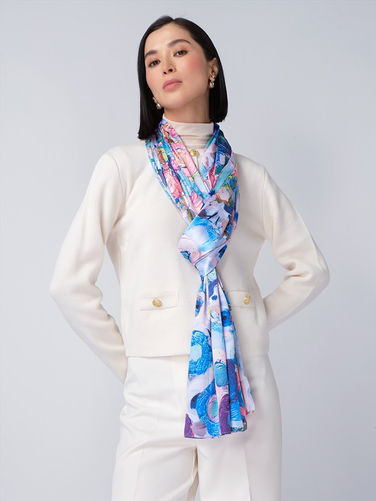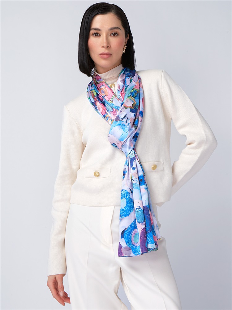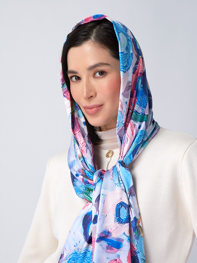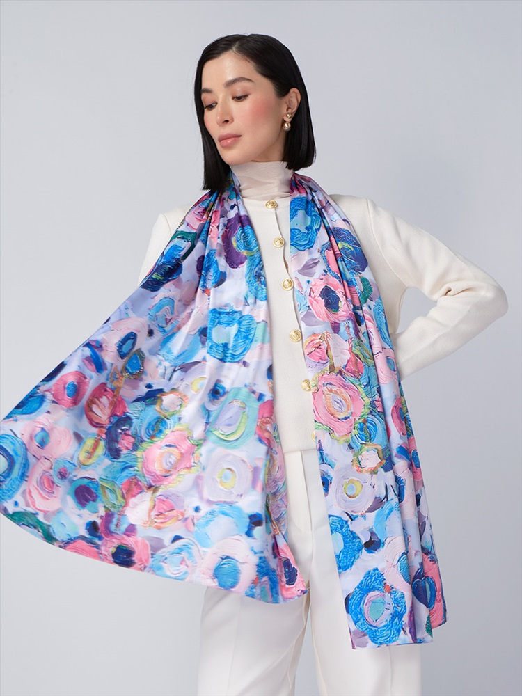 Цвет: Голубой Состав: 45% полиэстер, 35% вискоза, 20% шелк Состав: Вискоза, Полиэстер, Шелк Размер: 70 х 185 см Принт: Абстракция Сезон: Осень, Весна Большой, мягкий, тонкий и очень нежный палантин с рисунком. Только ручная стирка. Комментарии к товару