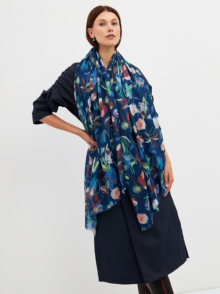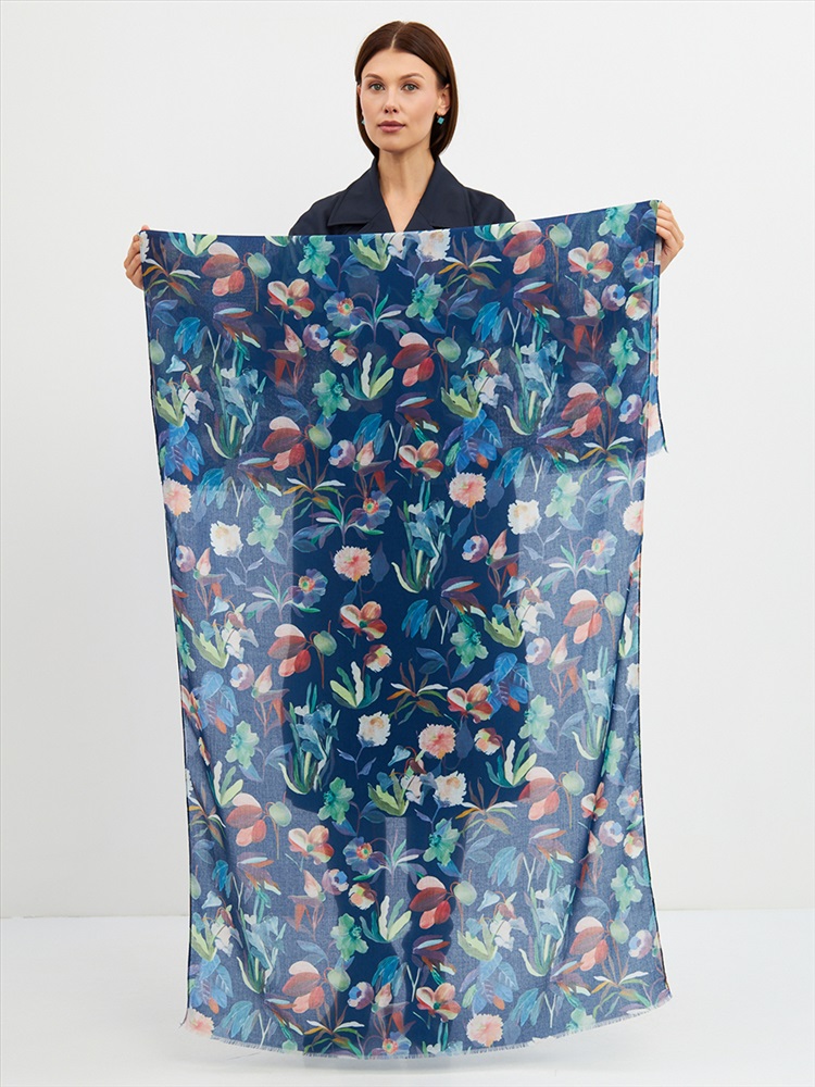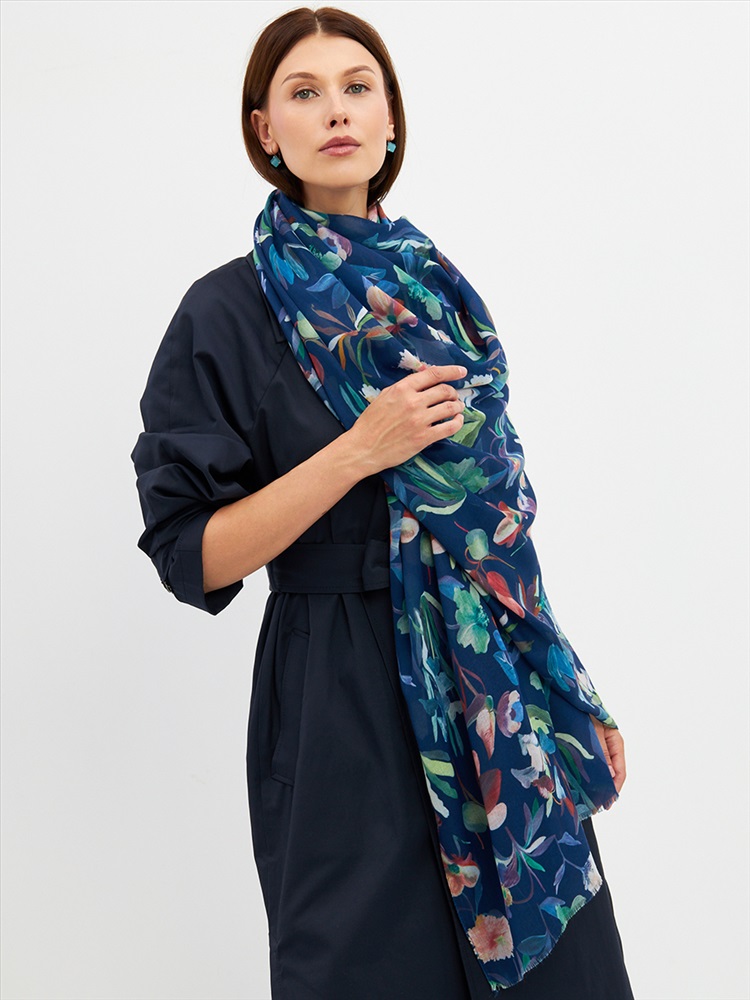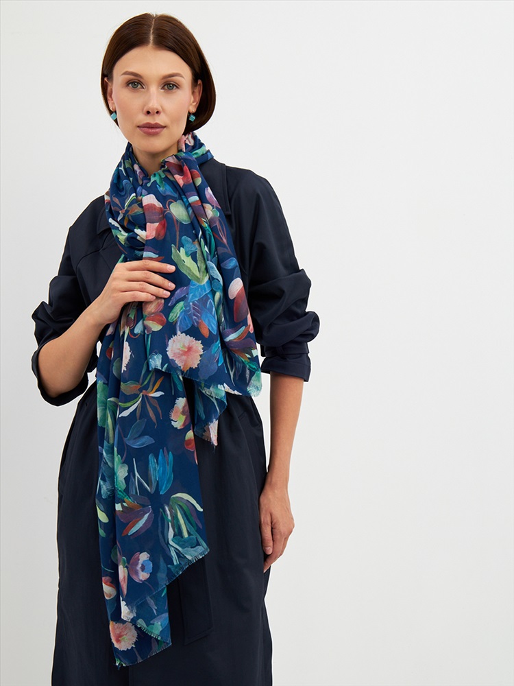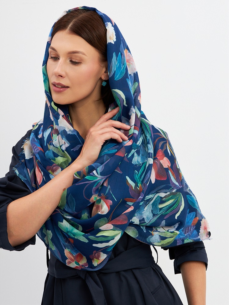 Цвет: Синий Размер: 80 x 180 см Состав: 55% полиэстер, 35% вискоза, 10% шелк Состав: Вискоза, Полиэстер, Шелк Принт: Абстракция Большой, мягкий, тонкий и очень нежный палантин с рисунком. Края изделия украшены бахромой ручной работы. Машинная деликатная стирка. Комментарии к товару