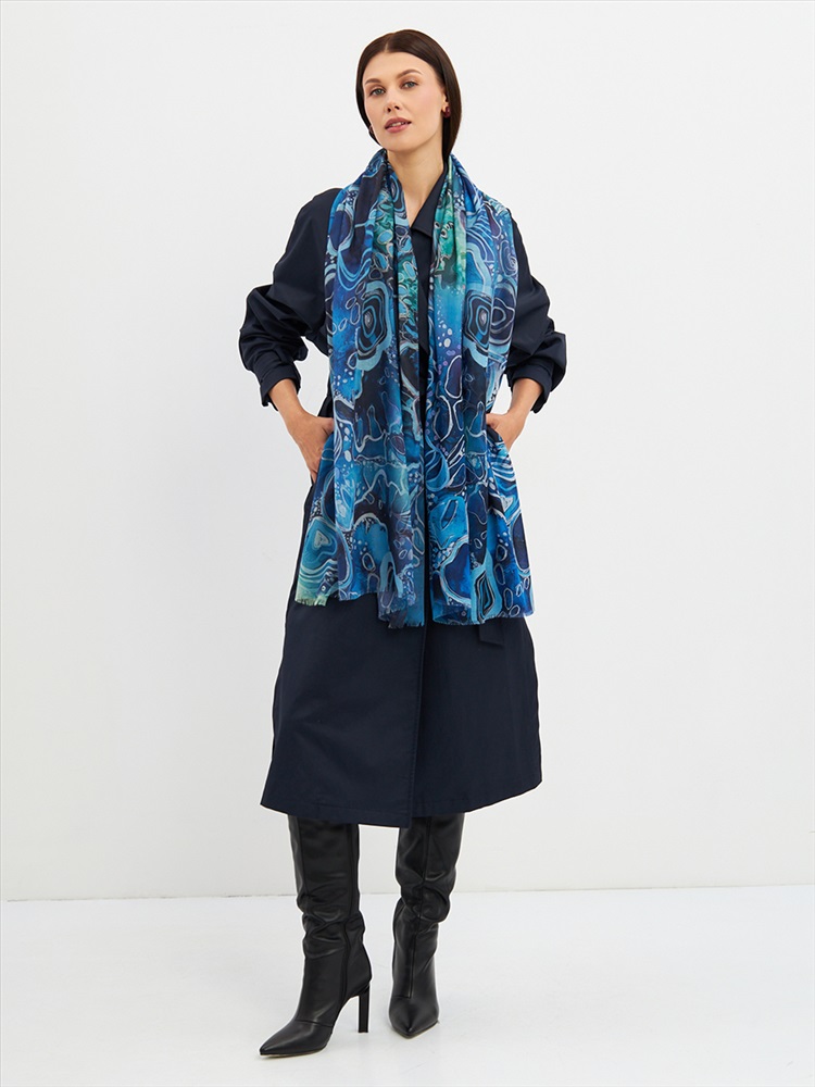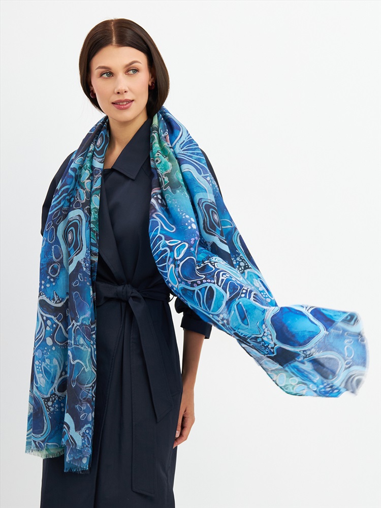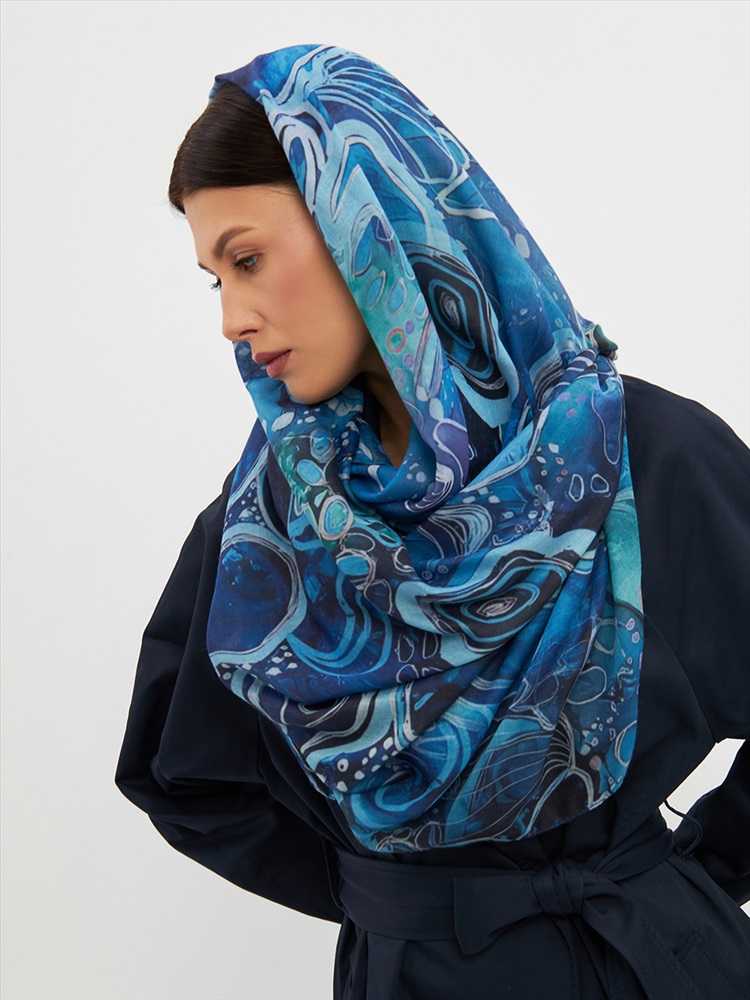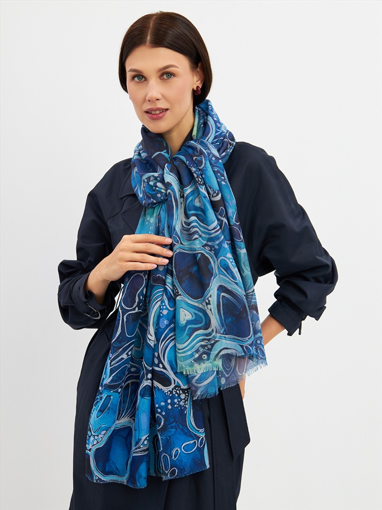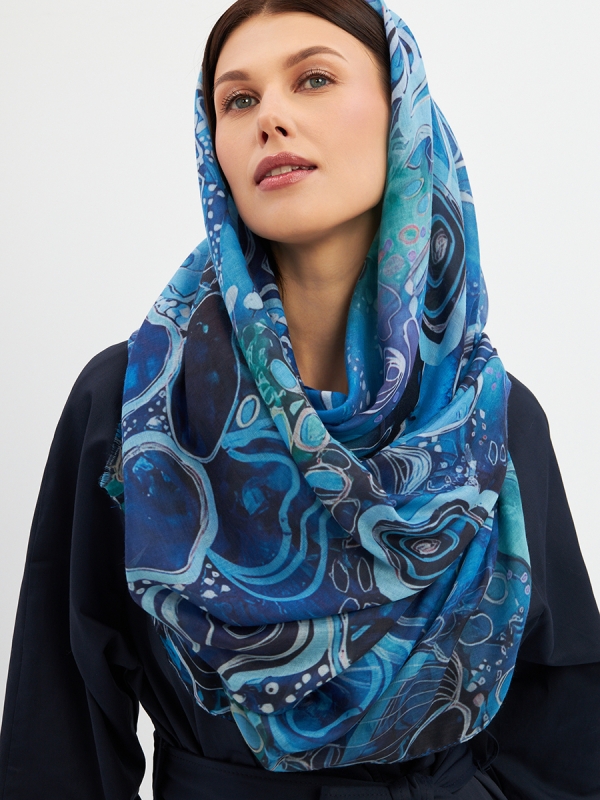 Цвет: Черный, Электрик, Светло-синий, Темно-синий Размер: 80 x 180 см Состав: 55% полиэстер, 35% вискоза, 10% шелк Состав: Вискоза, Полиэстер, Шелк Принт: Абстракция Большой, мягкий, тонкий и очень нежный палантин с рисунком. Края изделия украшены бахромой ручной работы. Машинная деликатная стирка. Комментарии к товару