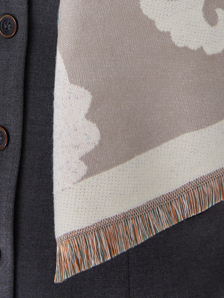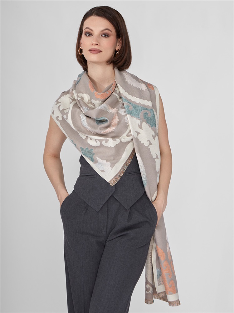 Цвет: Бежевый, Персик, Серый Состав: 65% модал, 20% шерсть, 15% кашемир Состав: Шерсть, Модал, Кашемир Принт: Абстракция Размер: 65 x 180 cм Сезон: Демисезон, Осень, Весна Стиль: Повседневный Большой, мягкий, теплый двусторонний палантин. Только ручная стирка. Комментарии к товару
