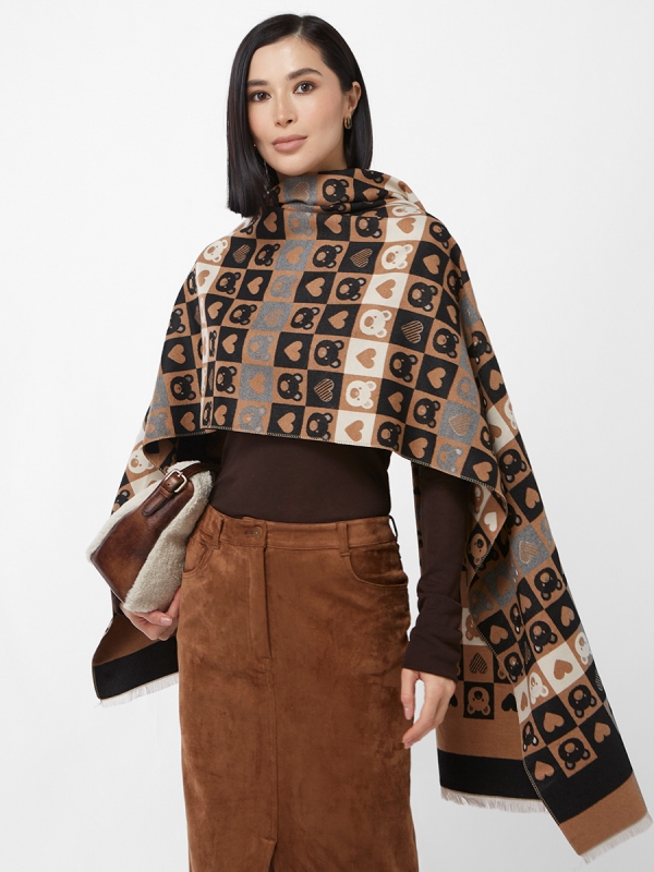 Цвет: Коричневый, Молочный, Черный Состав: 45% модал, 20% вискоза, 20% шерсть, 15% кашемир Состав: Вискоза, Шерсть, Модал, Кашемир Принт: Сюжетный Размер: 65 х 180 см Сезон: Осень, Зима Стиль: Повседневный Большой, мягкий, теплый однотонный двусторонний палантин. Только ручная стирка. Комментарии к товару