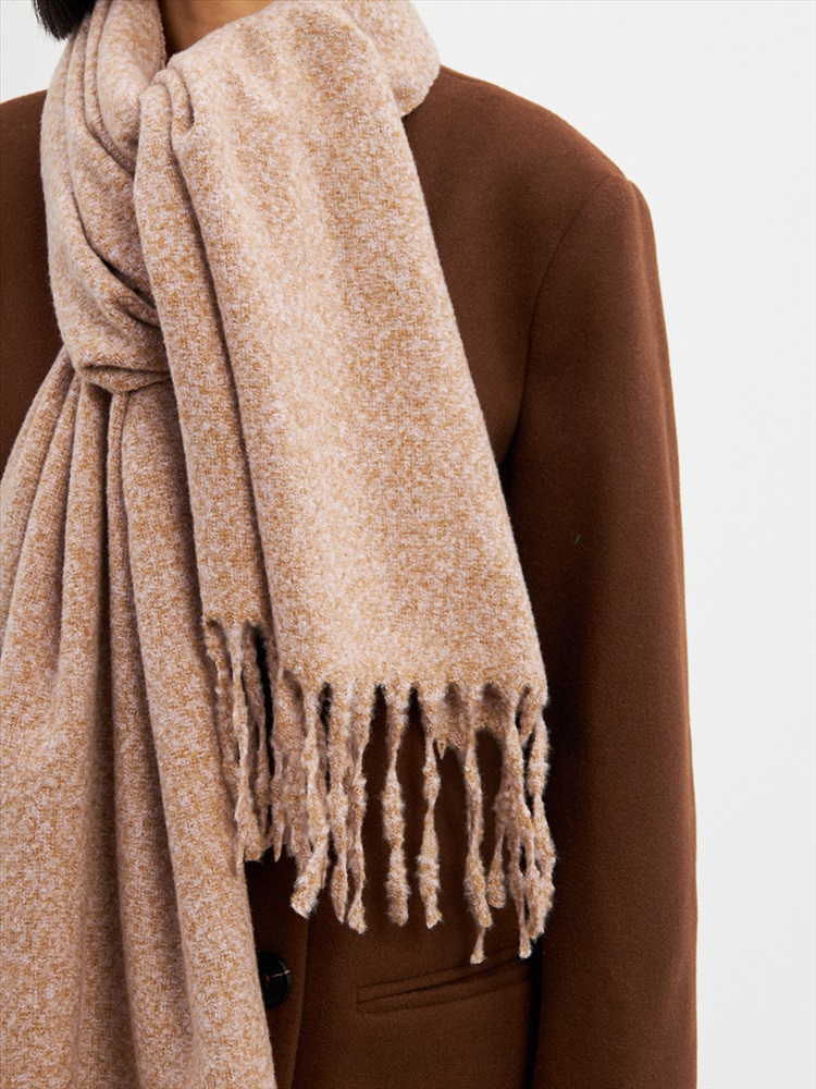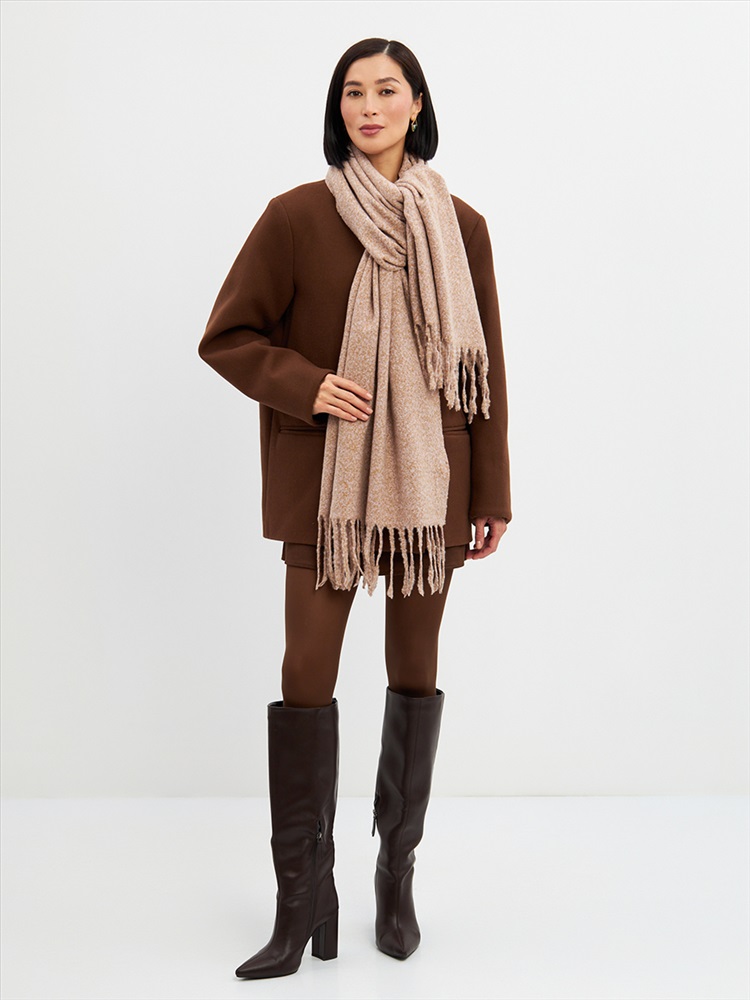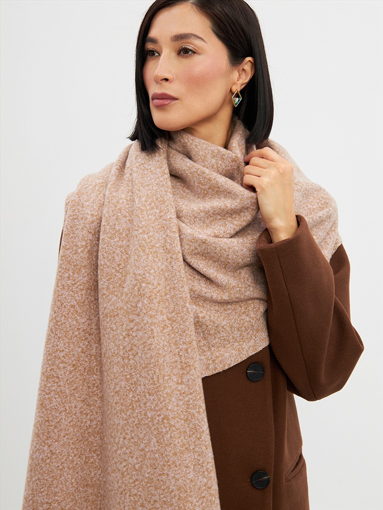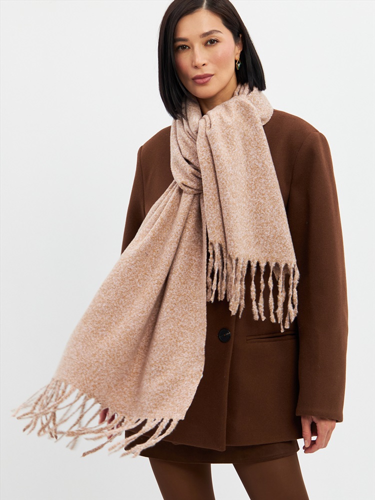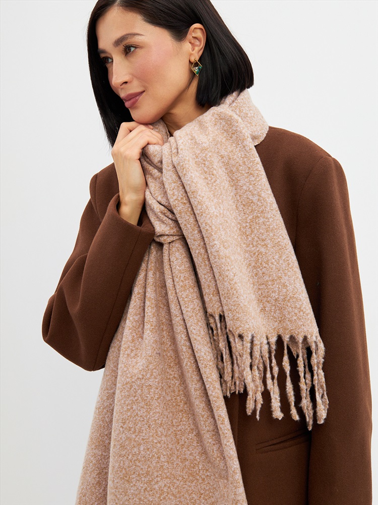 Большой, мягкий, теплый двусторонний однотонный меланжевый палантин. Края изделия украшены бахромой. Машинная деликатная стирка.