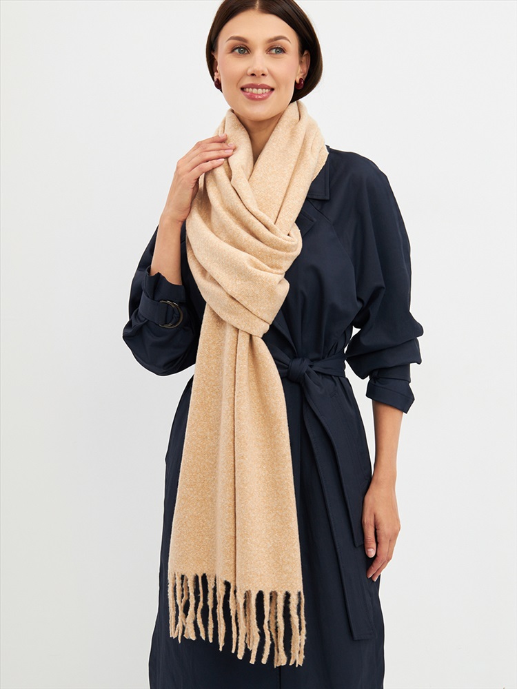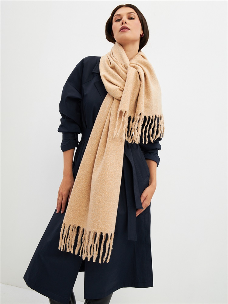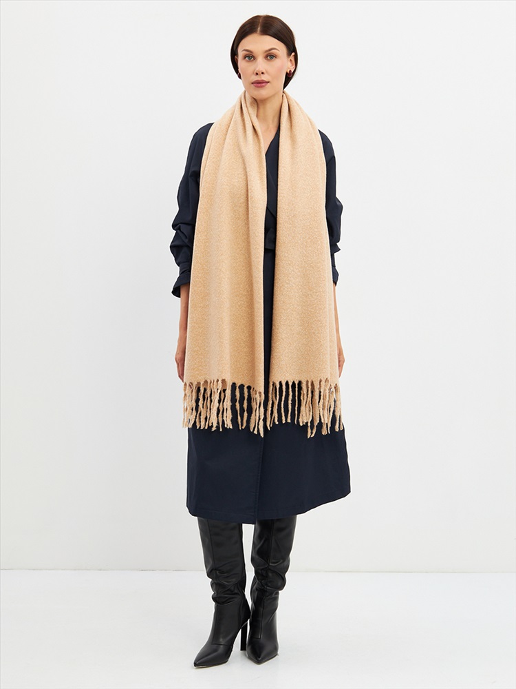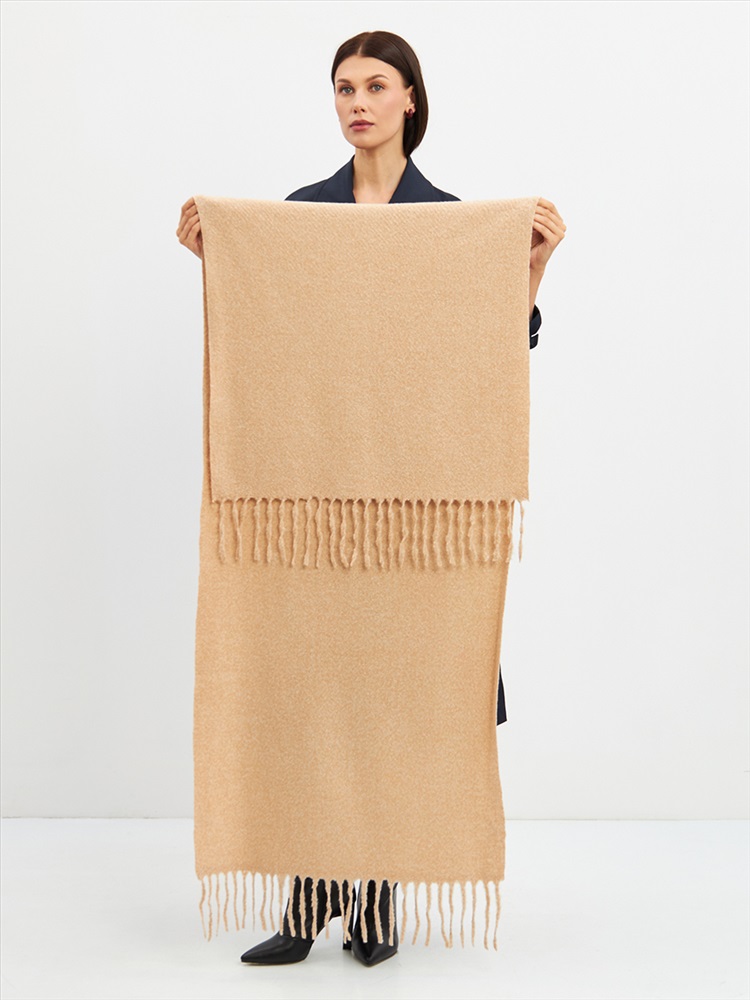 Большой, мягкий, теплый двусторонний однотонный палантин. Края изделия украшены бахромой. Машинная деликатная стирка.