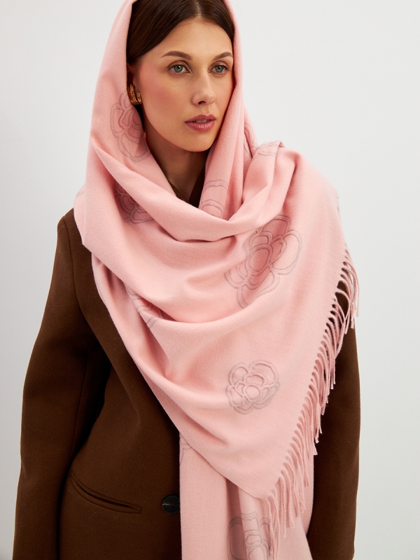 Большой, мягкий, теплый двусторонний однотонный палантин с принтом-печатью. Края изделия украшены бахромой. Машинная деликатная стирка.