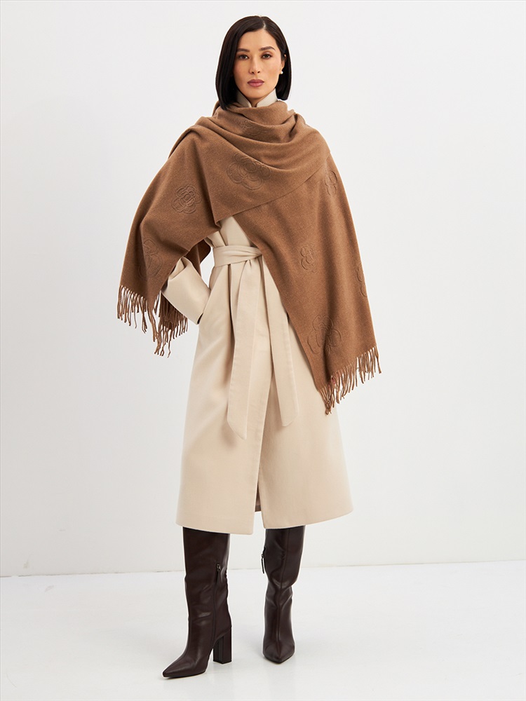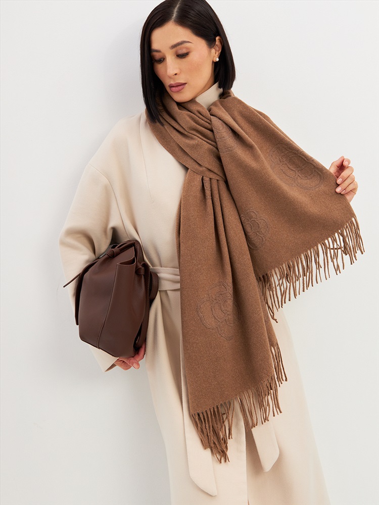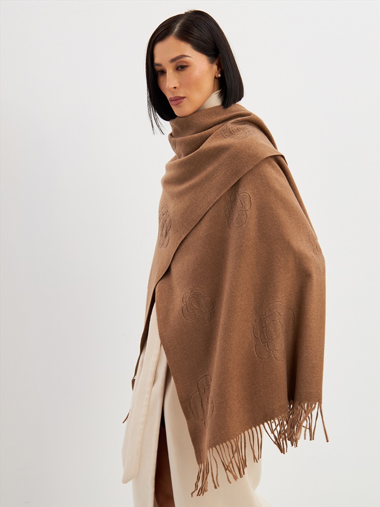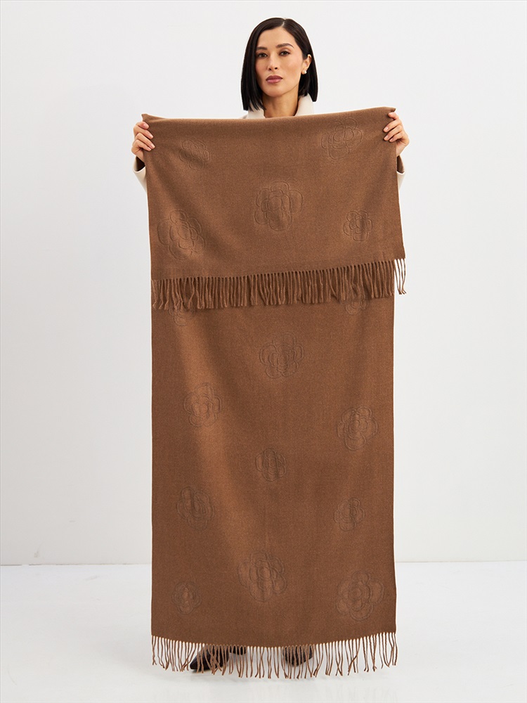 Большой, мягкий, теплый двусторонний однотонный палантин с принтом-печатью. Края изделия украшены бахромой. Машинная деликатная стирка.