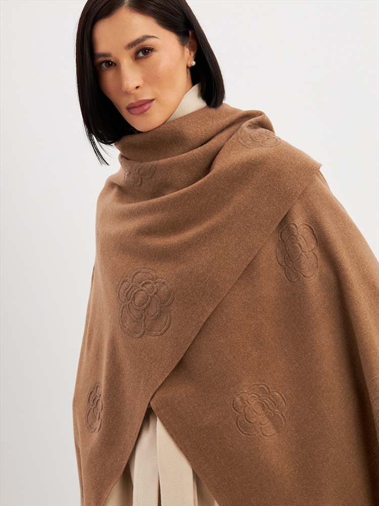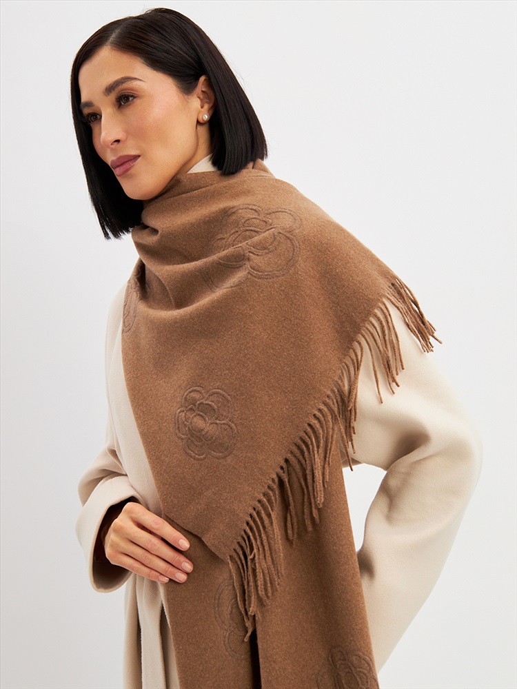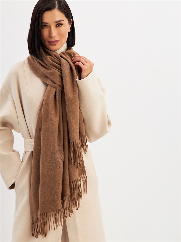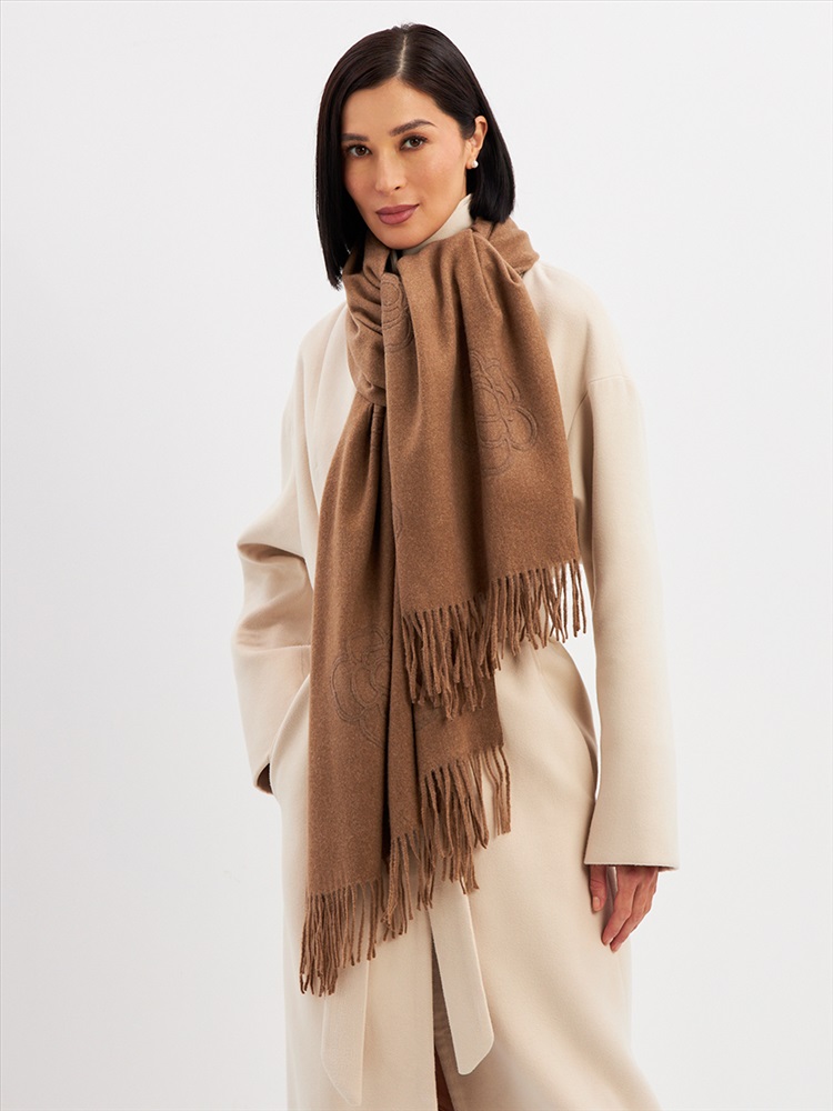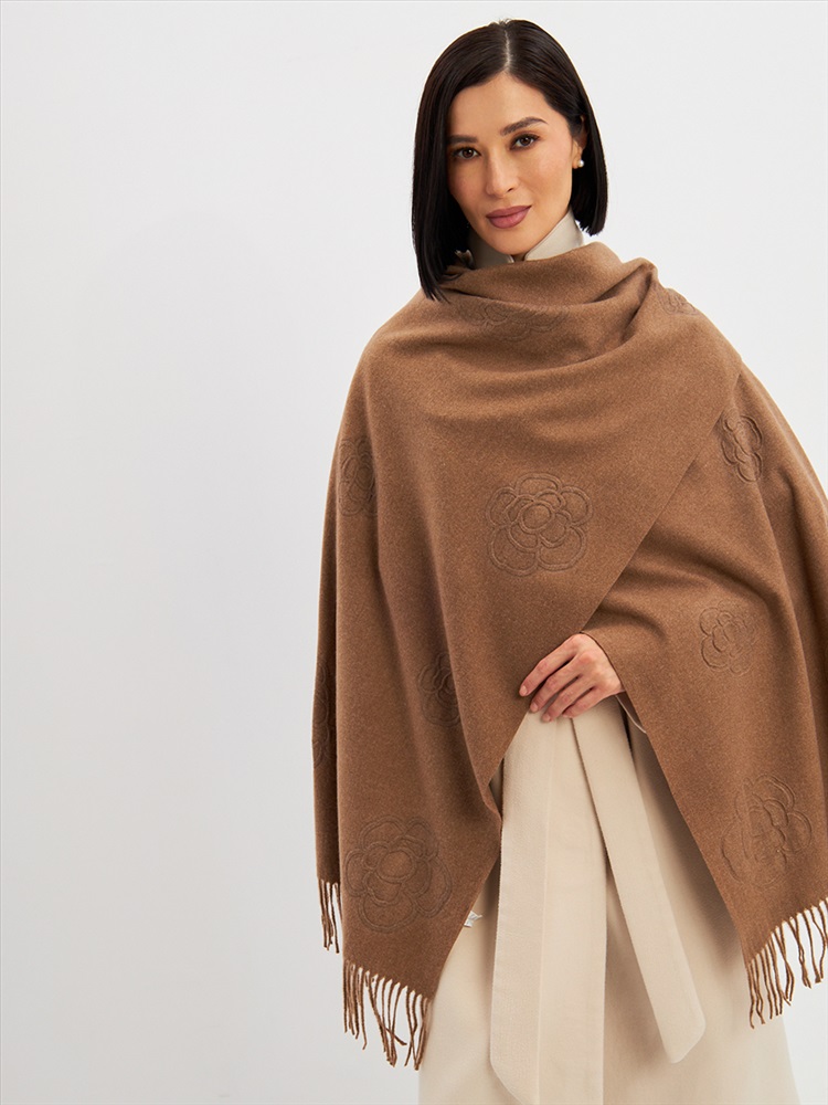Большой, мягкий, теплый двусторонний однотонный палантин с принтом-печатью. Края изделия украшены бахромой. Машинная деликатная стирка.