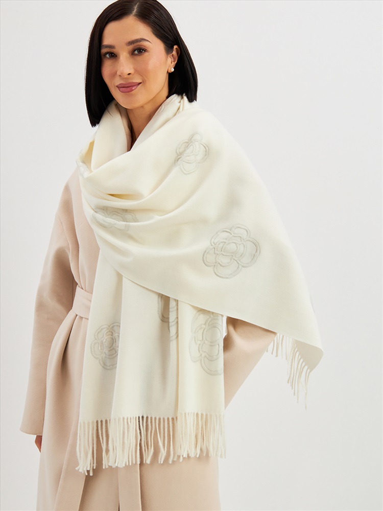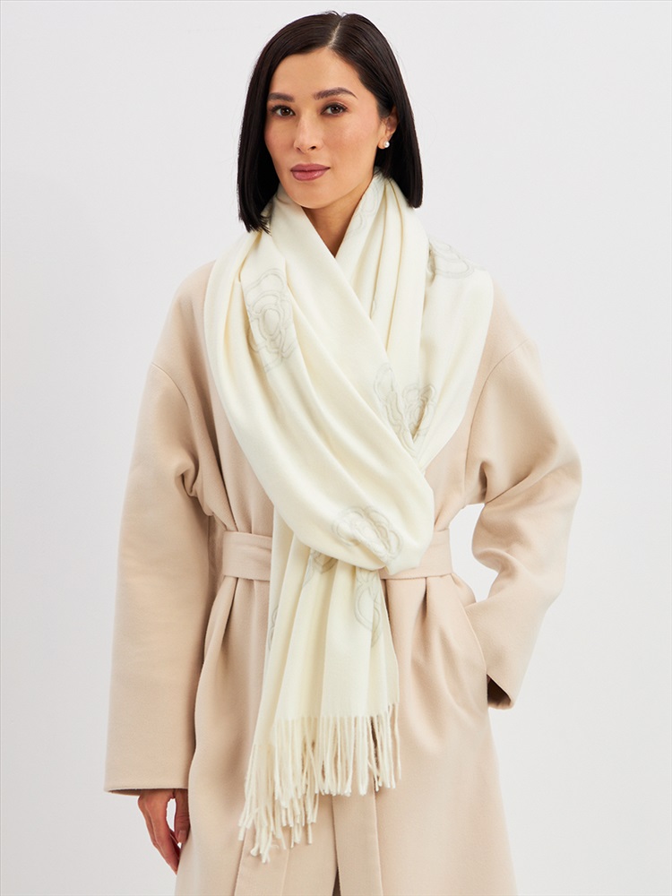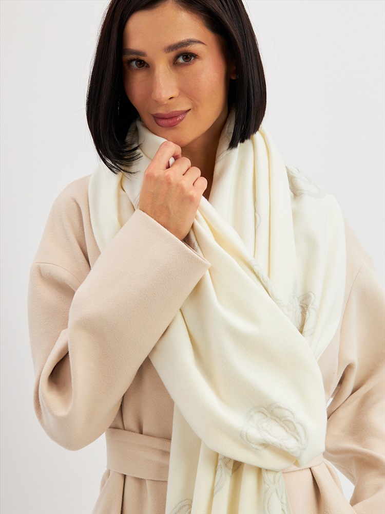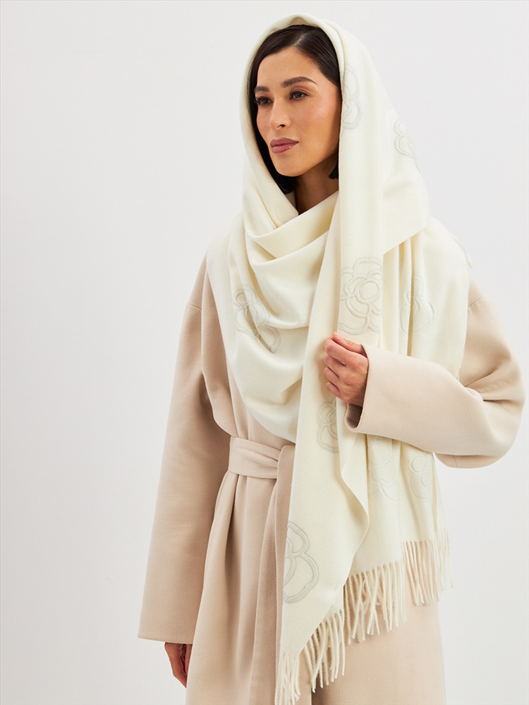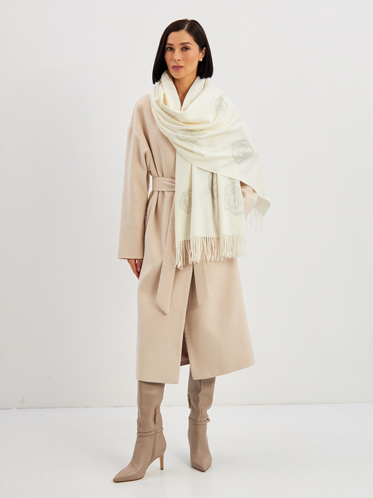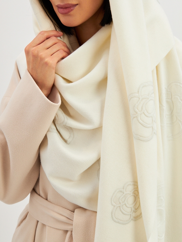 Большой, мягкий, теплый двусторонний однотонный палантин с принтом-печатью. Края изделия украшены бахромой. Машинная деликатная стирка.